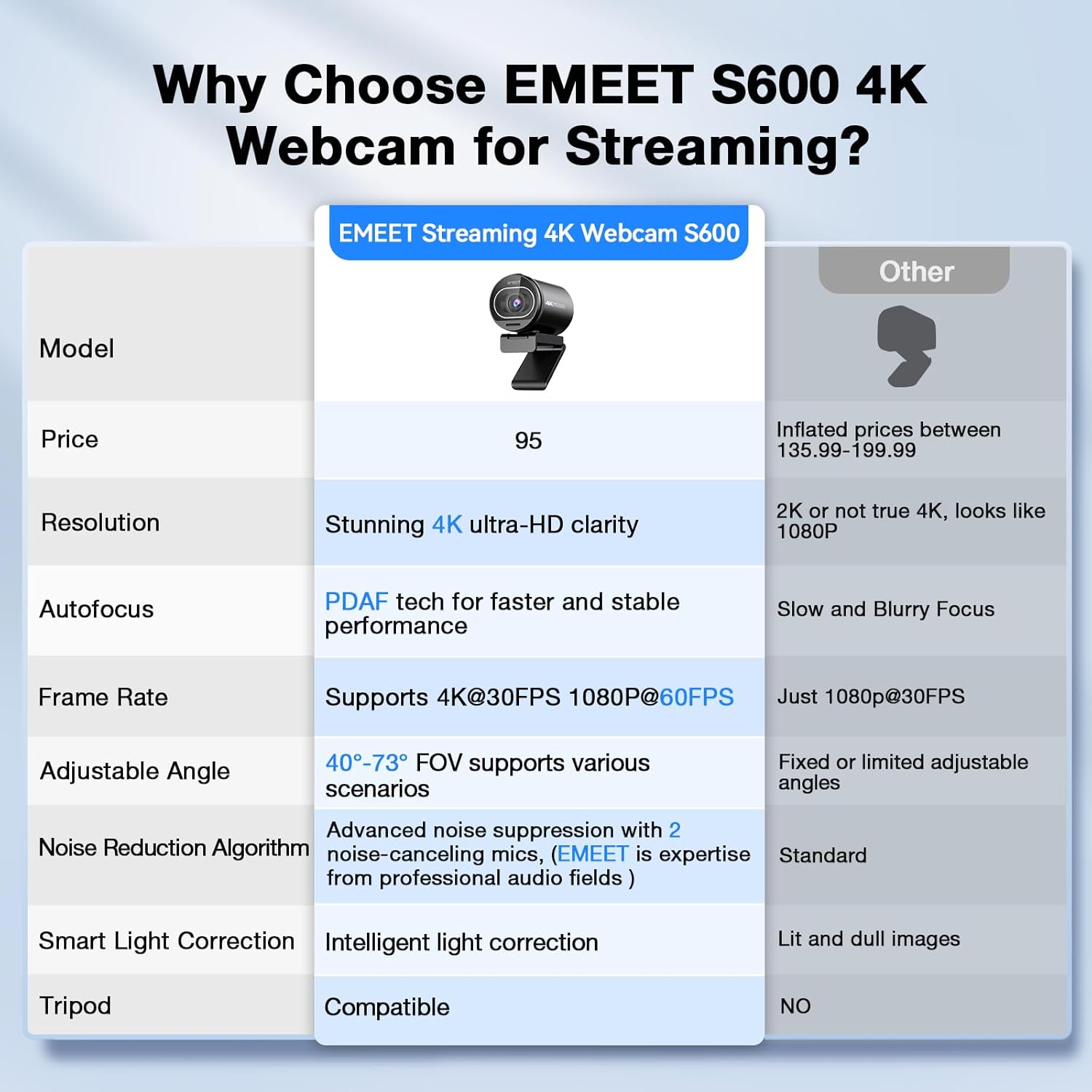 Advanced PDAF Autofocus & Light Balance – 4K webcam S600’s PDAF(Phase Detection Autofocus) tech offers significant advantages over common autofocus such as faster speed, higher precision, and more stable performance in various scenes features. Its auto light adjustment capability balances shadows and highlights even in low-light environments, keeping every detail sharp and clear on screen, making it ideal for content creators and live streamers who demand top-tier performance and visual quality.