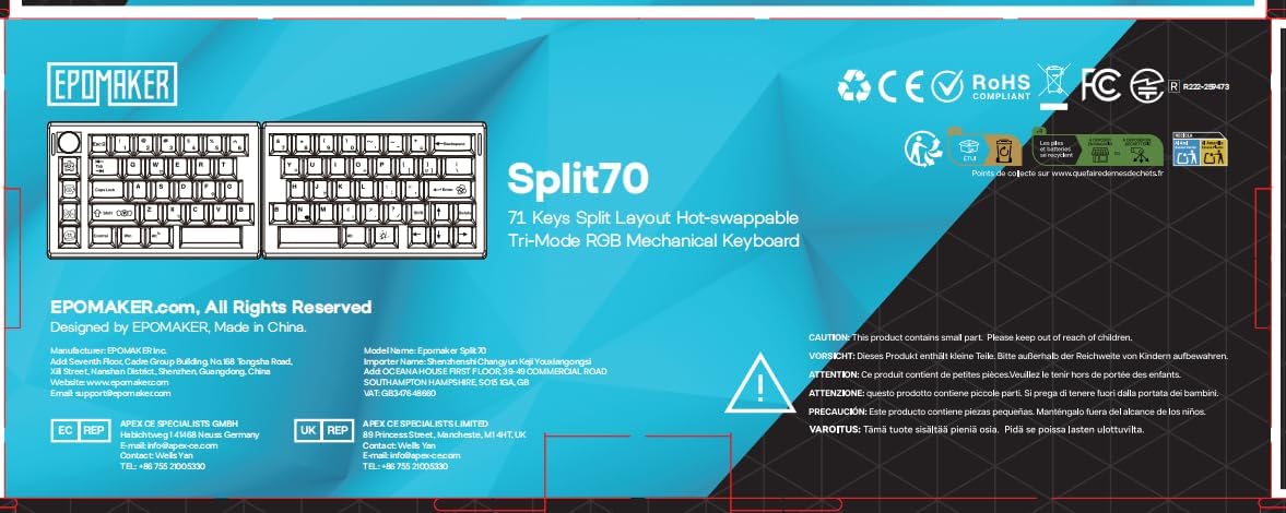Long-Lasting RGB Keyboard: Aesthetics and functionality, the split70 RGB keyboard offers both with consistent vibrant atmosphere lights, from 71 south-facing LEDs customizable in saturation, tone, brightness and speed. Equipped with a 3000mAh rechargeable battery, Split70 wireless keyboard is ready for hours of long-term use with stability and 1000Hz low latency (2.4G/Cable).