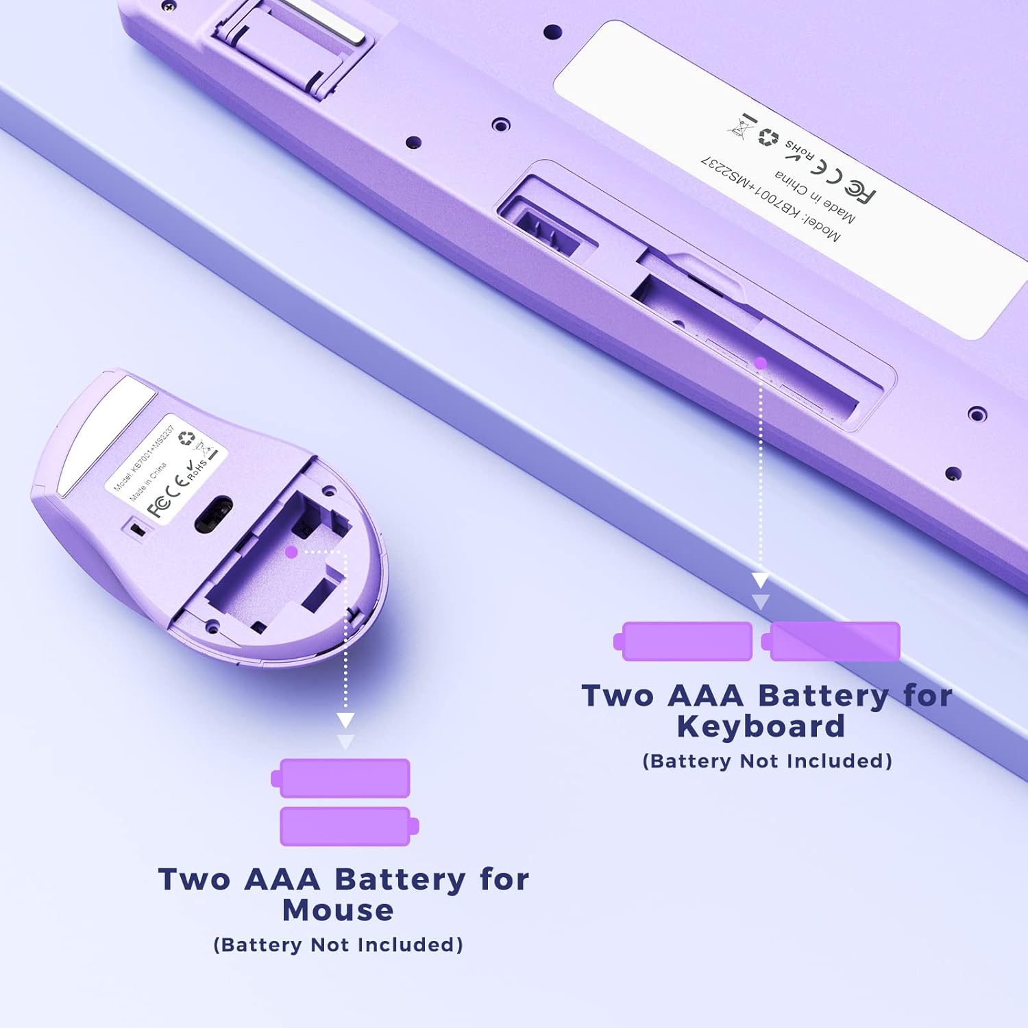2 AAA batteries required for the keyboard, and 2 AAA batteries required for the mouse(BATTERY NOT INCLUDED). The ergonomic keyboard mouse will fall into sleep mode after 5 minutes without action, There is an ON/OFF button on both of the wireless mouse and keyboard, so you can turn them off when you are finished using it for energy saving.