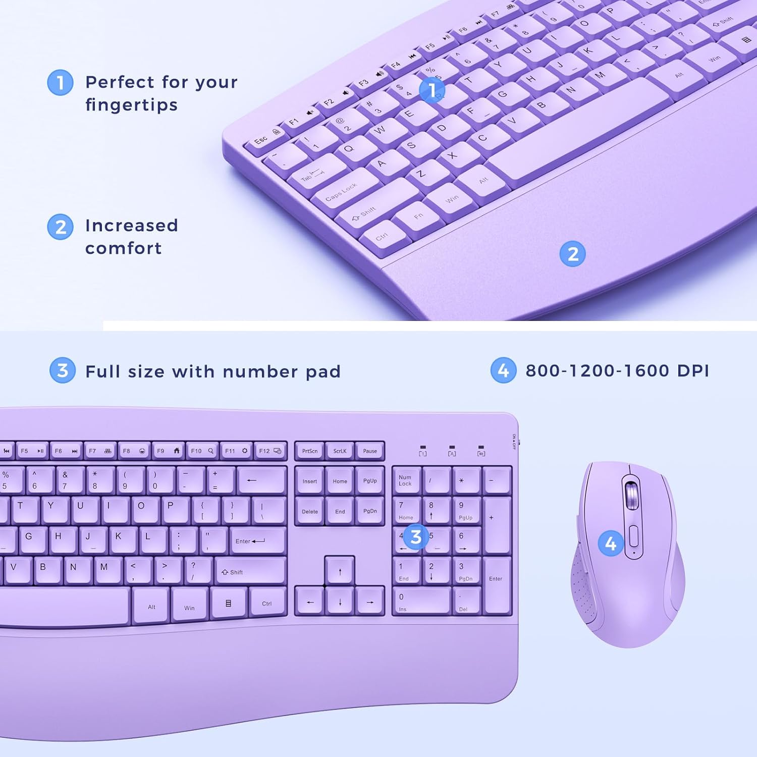The keyboard with a build-in palm rest, and also has little kickstands to create a slight tilt allowing your wrists to rest comfortably while typing, combined with a ergonomic wireless mouse, allows you to work comfortably for all days!