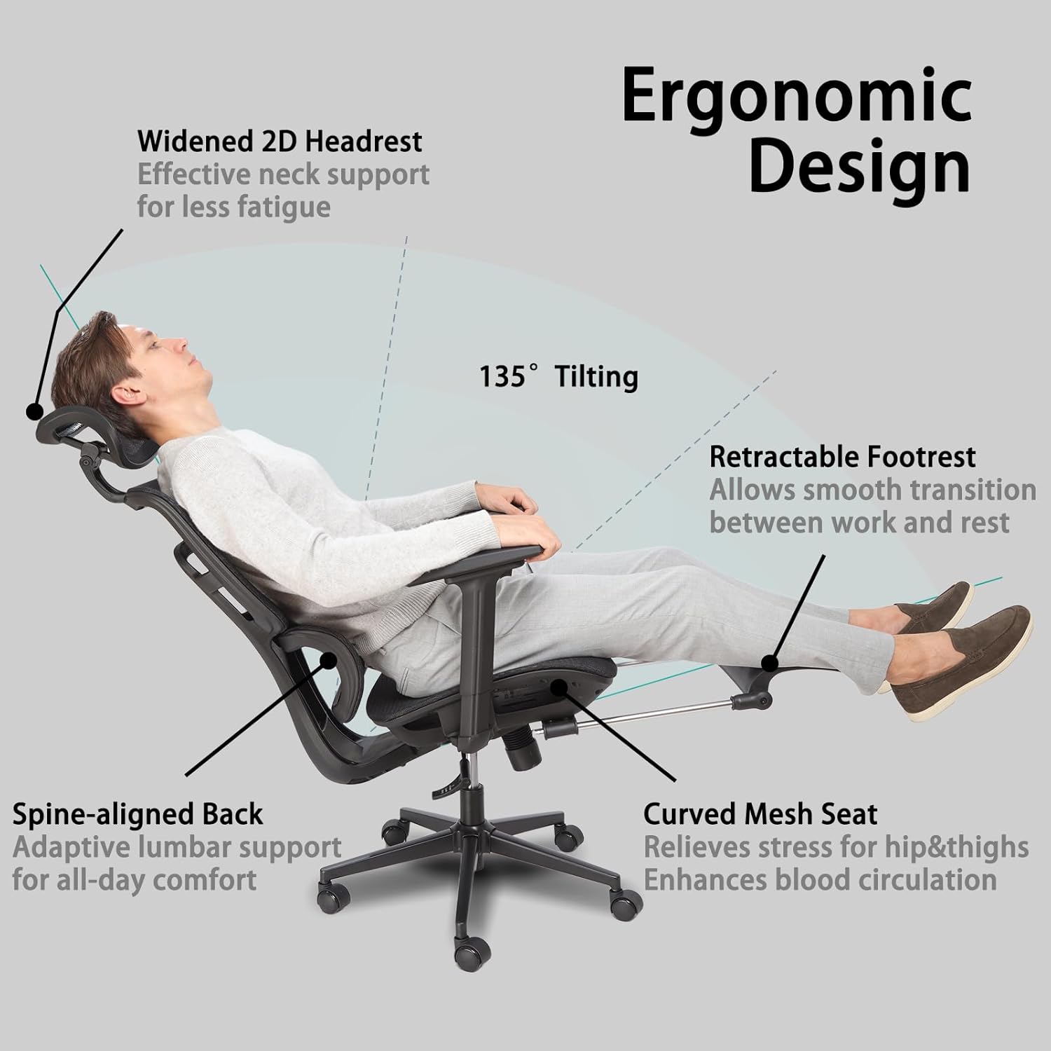 【Advanced Adjustability Tailored for You】Featured with large 2D headrest, 4D armrests, adaptive lumbar support, 3-stage reclining back up to 135° and 19″ retractable foot rest to adapt different body types from big and tall to slim and small.