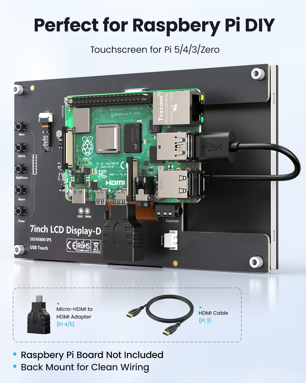 ADAPTER FOR EASY CONNECTION: Designed with developers in mind, this Raspbery Pi screen includes a micro HDMI to HDMI adapter for full compatibility with Raspberry Pi 5/4/3 and other HDMI-enabled devices. Perfect for prototyping, hardware testing, or everyday use