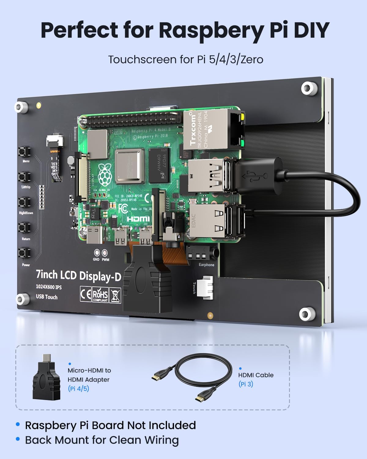 It comes with a micro HDMI to HDMI adapter for easy, quick connection to Raspbery Pi 4/5 and other HDMI-enabled devices. Just plug and play!