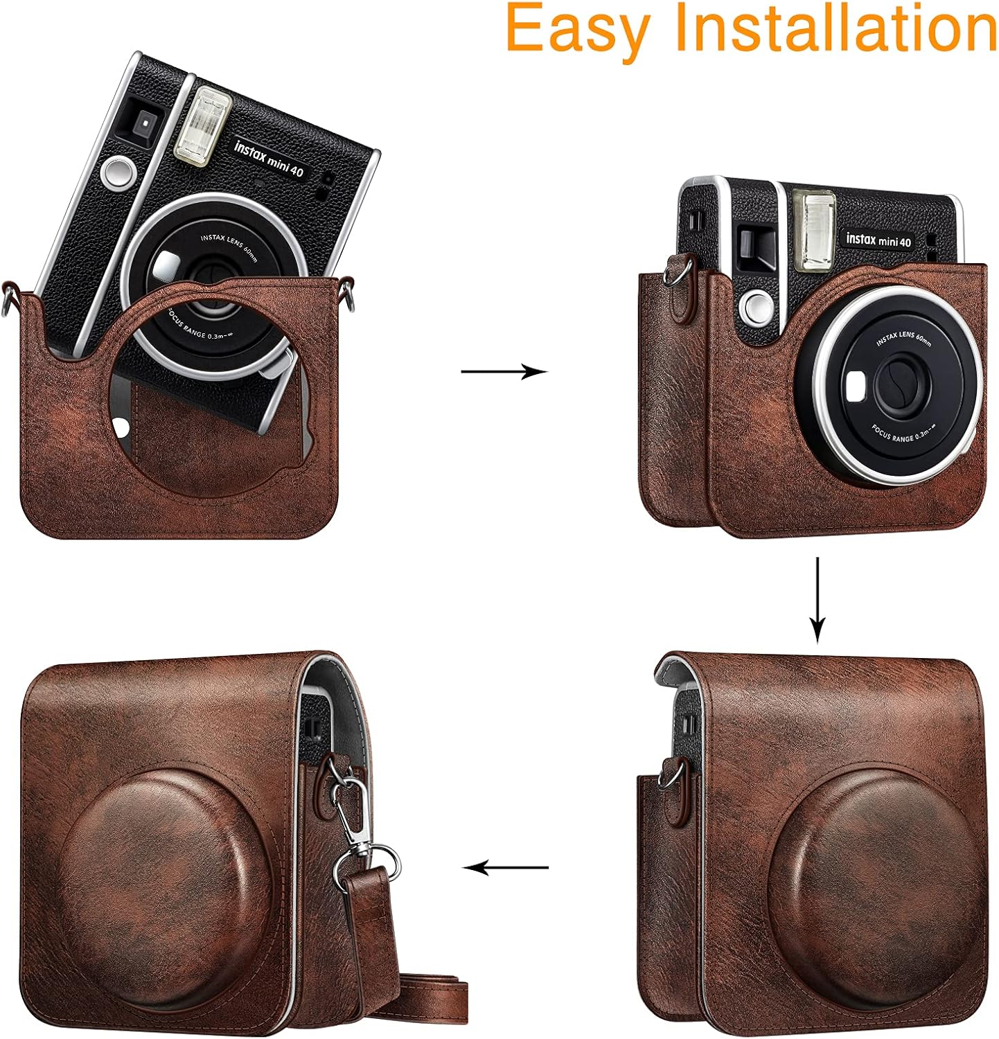 It comes with a case and a removable shoulder strap. Easy to install and secure. The premium synthetic leather with soft non-scratch microfiber interior provides great protection for your camera against scratches, dings, and other daily wear and tear. Built-in little pocket inside for mini photos. It also features a view window on the back telling you how many films left without opening the case.