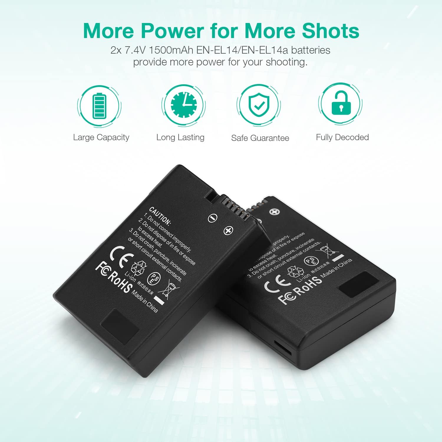 【Powerful Battery】1500mAh x2 | 7.4 V | Premium Lithium-ion without memory effect. Higher capacity to help you record more exciting moments, is a professional replacement for Nikon EN-EL14/EN-EL14a battery. Carry 2 backup batteries for emergency and you’re never left without power.