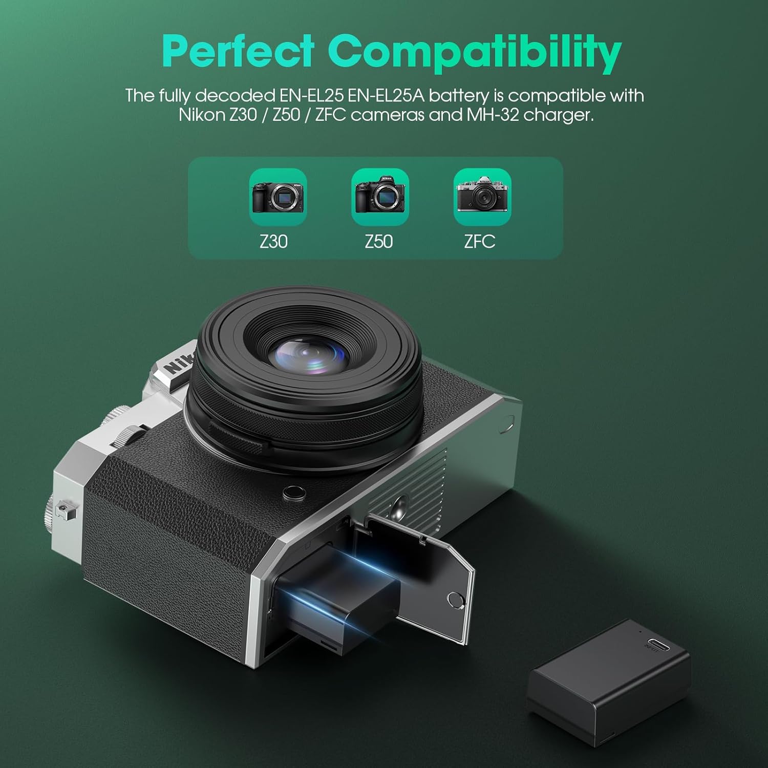 【Universal Compatibility】FirstPower fully decoded EN-EL25/EN-EL25a battery is fully compatible with Nikon original cameras and chargers. It is compatible with Nikon Z30, Z50, ZFC cameras and MH-32 battery charger.