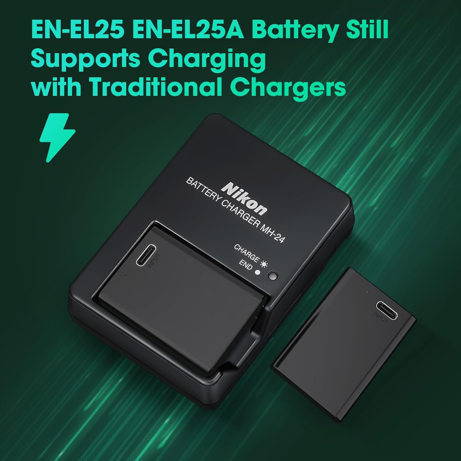 【Flexible Charging】The EN-EL25 EN-EL25A USB-C rechargeable camera battery can be charged using the included 2-in-1 USB-C charging cable, connecting to USB output devices such as power banks or wall chargers. It is also compatible with Nikon original chargers.