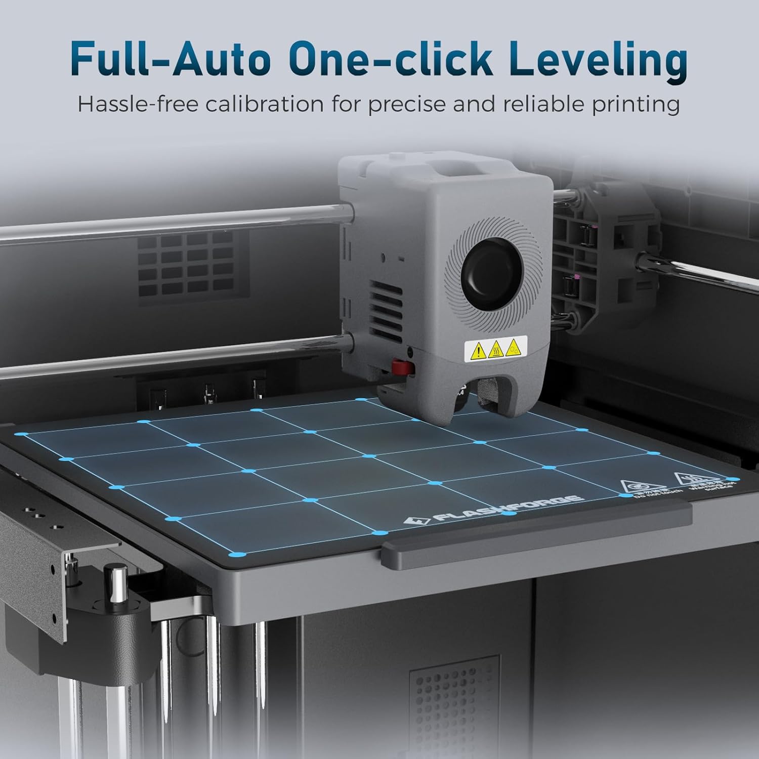 Full-Auto One-click Leveling. With the full-auto leveling system, Flashforge AD5M Pro 3D printer ensures hassle-free calibration for precise and reliable printing every time.