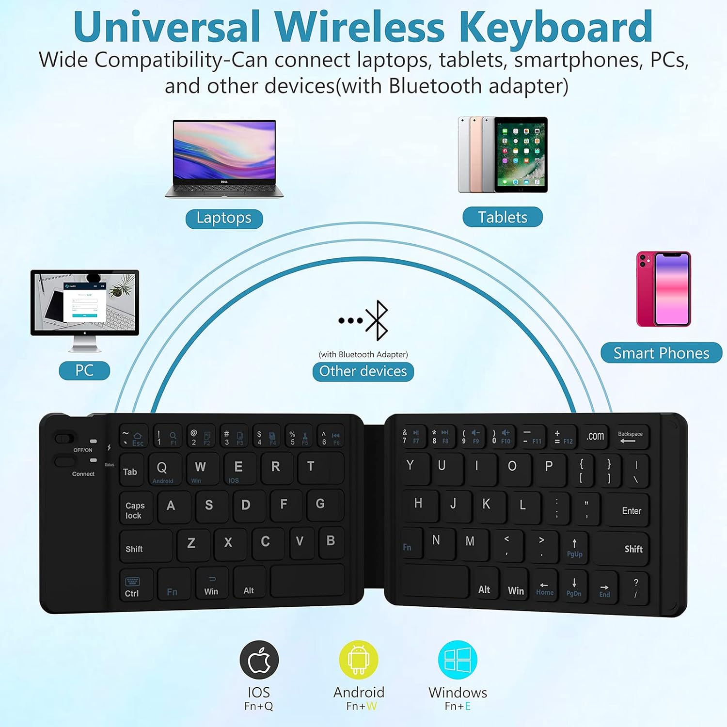 ⌨【Bluetooth Foldable Keyboard】 Portable folding keyboard allows you to work anywhere, anytime! Standard-size but folding design provides accurate, fast typing and efficiency, just like the desktop keyboard you are used to. Quiet keys allow you to focus on your work. Light-weight and rechargeable, perfect for travel and business trips.