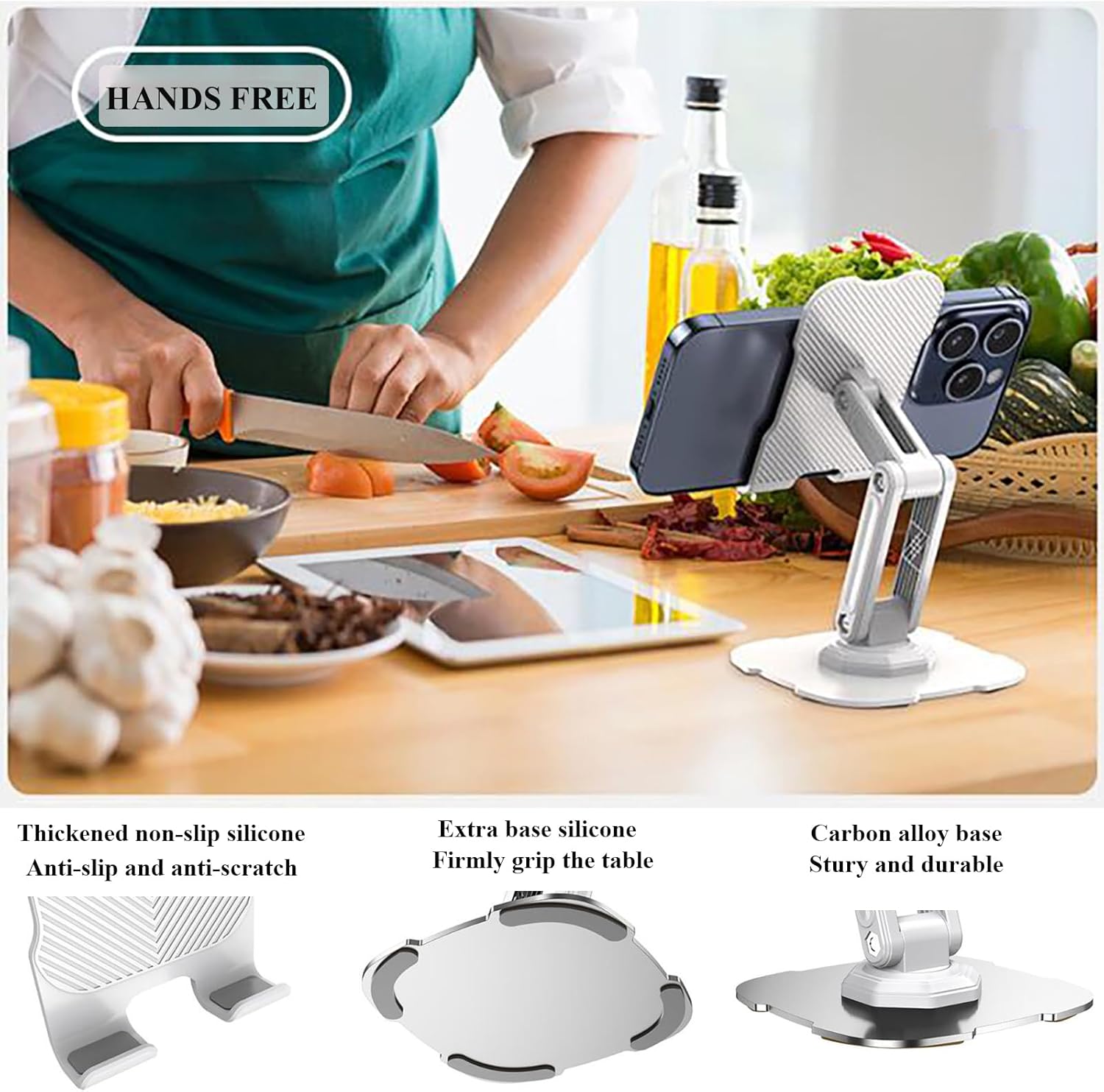 Angle & Height Adjustable: This portable phone stand can be rotated 360-degrees at the bottom, and the 2 sections stretchable support bar which can be adjusted up and down(11cm/4.33inch), which meets your viewing demand in different occasion