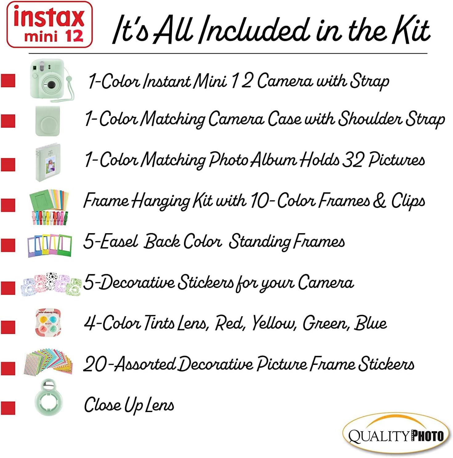 Value accessory bundle. Includes the famous Fujifilm Instax Mini 12 Camera (color your choice) with a matching Camera Case to keep the camera protected. Photo Album, perfectly sized for the instant prints. Many more accessories including frames to hang and decorate you photos, stickers, close up color lenses, and camera sticker for added color. The newly updated Fujifilm instax Mini Camera 12 features a slim body with newest design. Parties, birthdays anniversaries, carnivals or gifts… all are times to use the Fujifilm Instax Camera, You will not regret the Mini 12 buy. The most valued gift bundle for the best price!