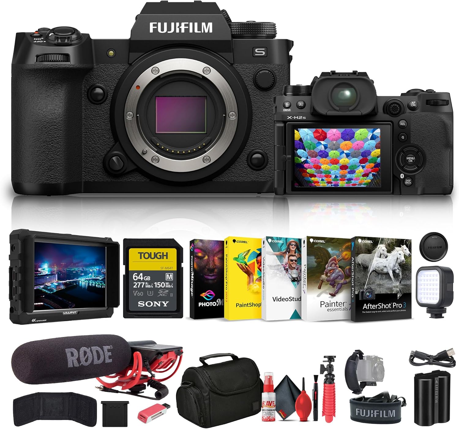 Bundle Items Include: 1 x Fujifilm – X-H2S Mirrorless Camera, 1 x Lilliput A7S 7″ Full HD Monitor, 1 x Rode VideoMic Camera-Mount Shotgun Microphone, 1 x Sony 64GB SF-M Tough Series UHS-II SDXC Memory Card, 1 x Soft Bag, 1 x Memory Card Reader, 1 x Led Light, 1 x Corel Photo Software, 1 x 12_inch Flexible Tripod, 1 x Memory Card Wallet, 1 x Cleaning Kit, 1 x Hand Strap