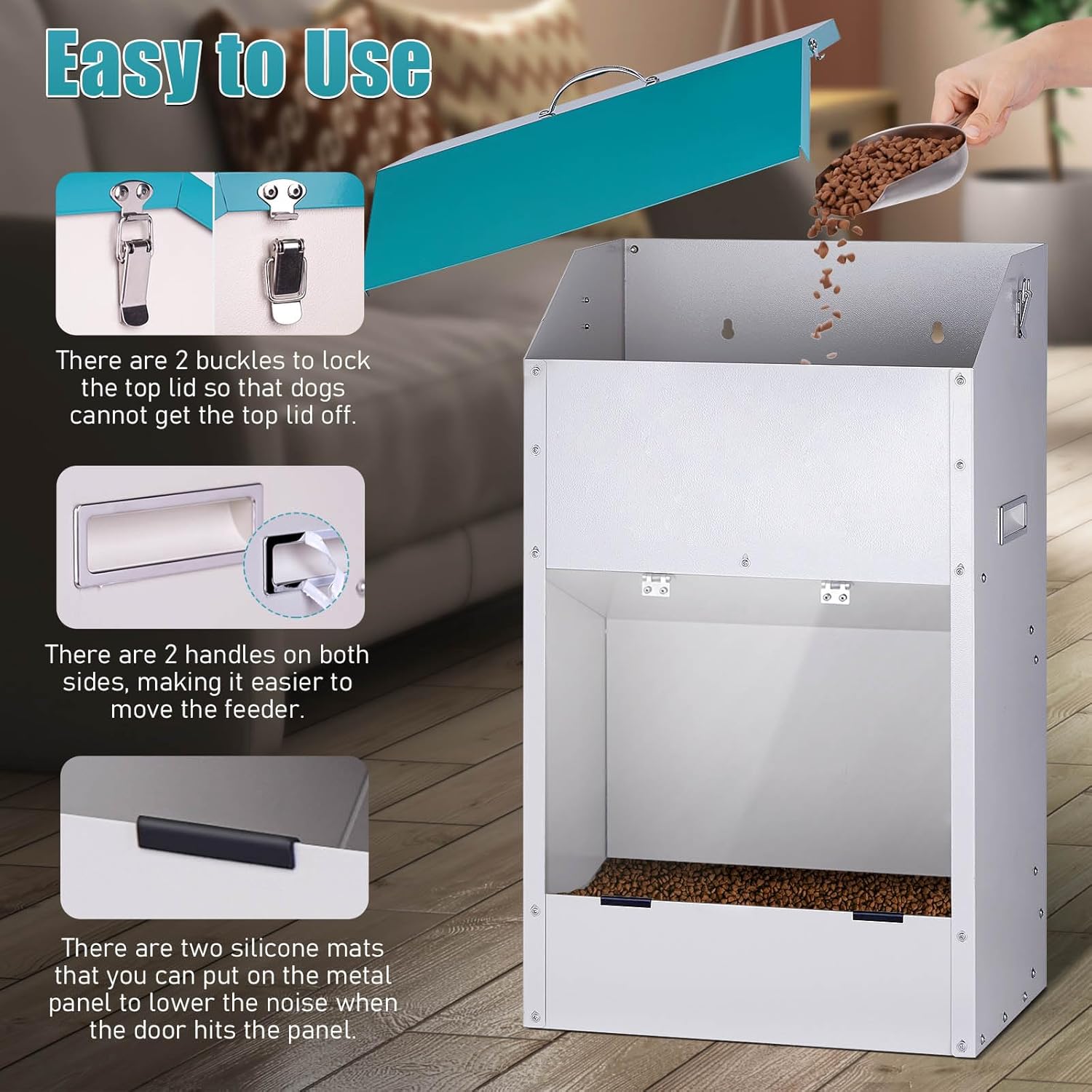 Transparent Door: The door of this extra large automatic dog feeder can be pushed open by dogs for food while keeping out birds, chickens, or other small animals; it keeps food fresh and dry and allows timely replenishment