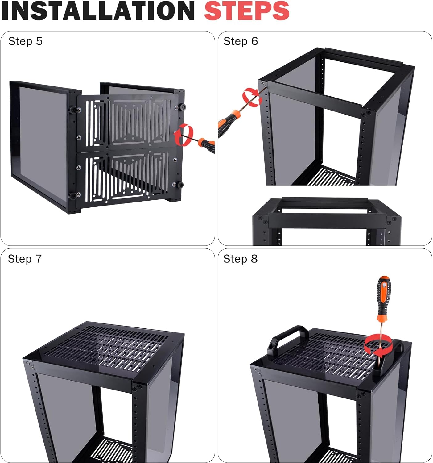 8U Standard: The cabinet has a height of 8U, which is a standard unit size. With 1U equaling 1.75 inches (4.4 cm), 8U implies a height of 14 inches (35.2 cm)
