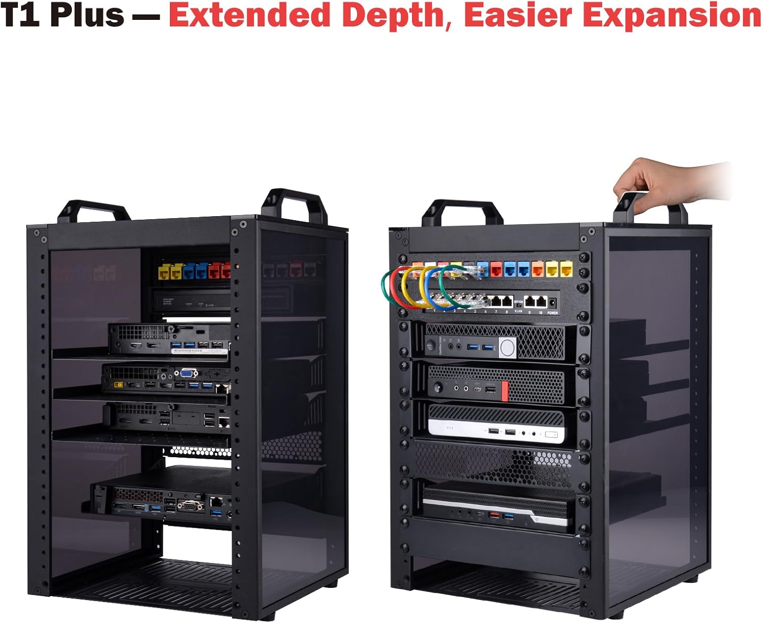 10-inch width: The cabinet has a width of 10 inches, which is a relatively small size that saves space while accommodating sufficient equipment. With dimensions of 11.06×10.23×16.45 inches (28.1x26x41.8 cm), it is suitable for small offices, home environments, and large enterprises looking to save space, The T1 Plus is particularly well-suited for NAS devices with a depth of 260mm.