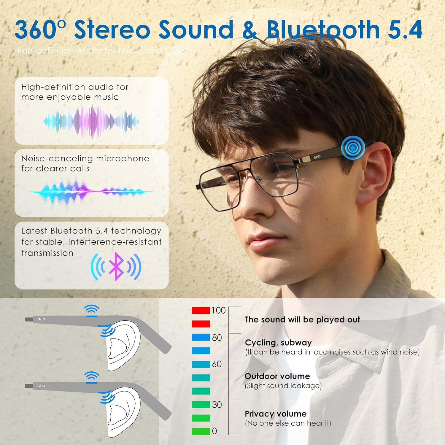 Music Glasses: GetD smart music glasses are equipped with the latest Bluetooth 5.4 technology, ensuring a stable connection and seamless support for Apple and Android AAC codecs. Each temple features dual sound outlets for enhanced stereo effects, paired with GetD’s advanced audio gain technology. This combination delivers superior sound quality, making every listening experience richer and more immersive. Perfect for enjoying music on the go.