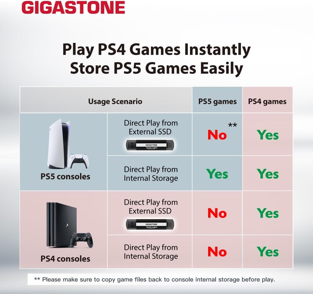 [Gaming Console Storage Expansion]: Boost your gaming experience with hyper-fast game load speed, compatible with PS5, PS4, Xbox Series X|S, and more. -Notice: External SSD must be formatted on PS4/PS5 before use and connected to “”SuperSpeed ports”” (USB-C SuperSpeed or USB-A SuperSpeed). -Notice: [PS5 consoles] PS5 games cannot be played directly from External SSD; please make sure to copy game files back to console internal storage before play. PS5 consoles can play PS4 games directly from an External SSD.