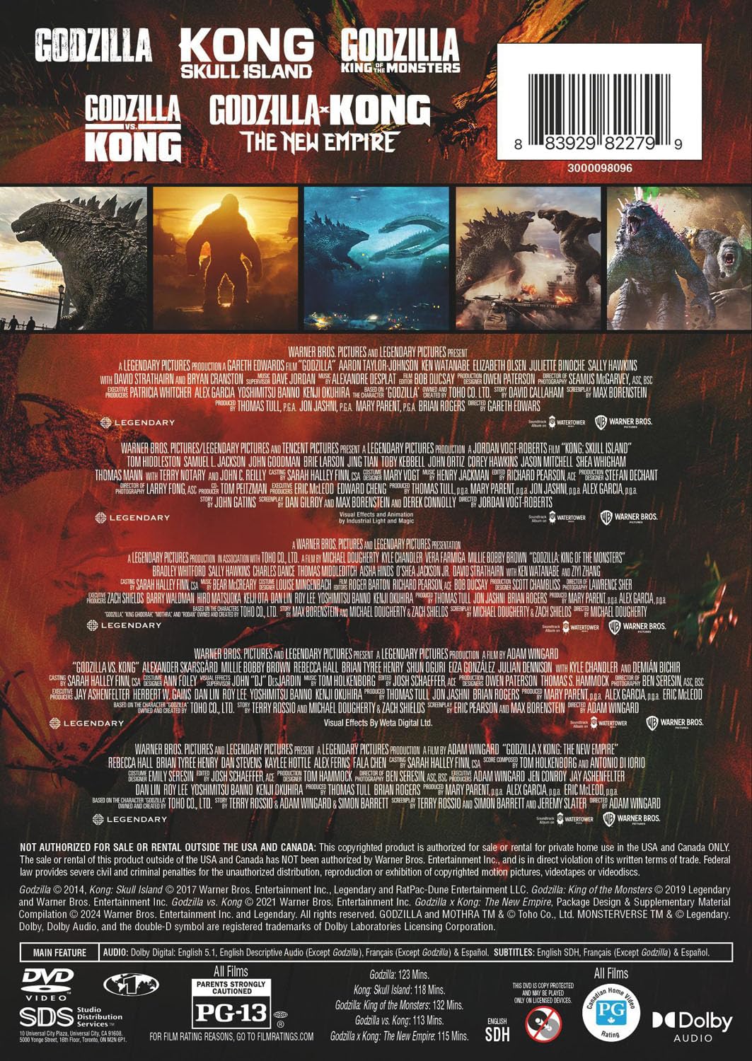 Godzilla (2014): This spectacular adventure pits Godzilla, the world’s most famous monster, against malevolent creatures that, bolstered by humanity’s scientific arrogance, threaten our very existence. Kong: Skull Island – When a scientific expedition to an uncharted island awakens titanic forces of nature, a mission of discovery becomes an explosive war between monster and man in a thrilling and original adventure that reveals the untold story of how Kong became King. Godzilla: King of the Monsters – When ancient god-sized monsters rise again, the crypto-zoological agency Monarch faces off against Godzilla, Mothra, Rodan, and King Ghidorah as they all vie for supremacy. Godzilla vs. Kong – Godzilla and Kong clash in a battle for the ages. As Monarch embarks on a mission into uncharted terrain, a human conspiracy threatens to wipe the creatures from the face of the earth. Godzilla x Kong: The New Empire – An all‐new adventure that pits the almighty Kong and the fearsome Godzilla against a colossal undiscovered threat hidden within our world, challenging their very existence—and our own.
