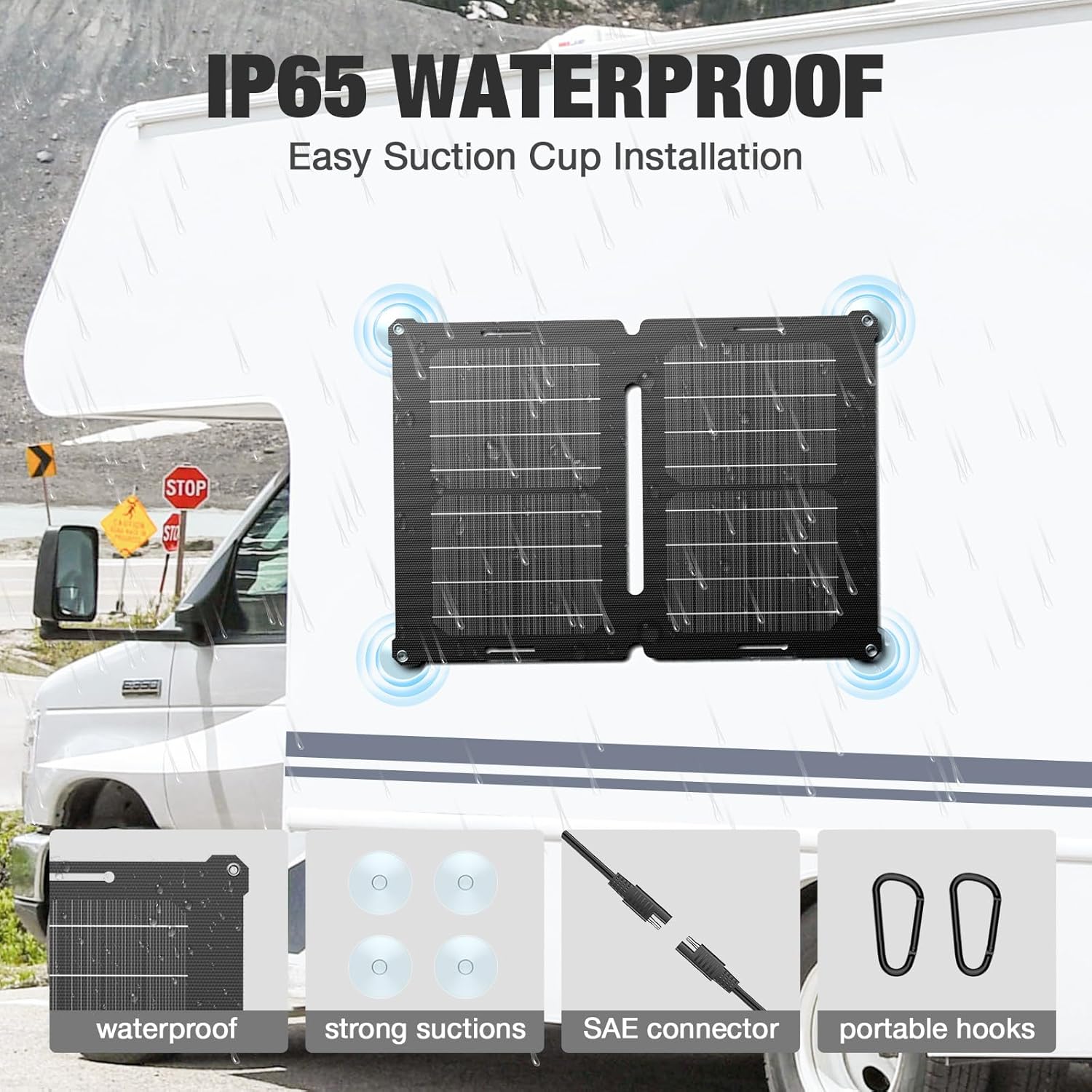 Come with 2 piece SAE cable kits, plug and play, easy to use. No electricity cost, free maintenance for outdoor use. Easy to install with pre-drilled holes on the back of panels for fast mounting and securing. Comes with carabiner and suction cup to meet your different installation needs. Suitable for automobiles, RVs, motorcycles, ships,snowmobile, etc.