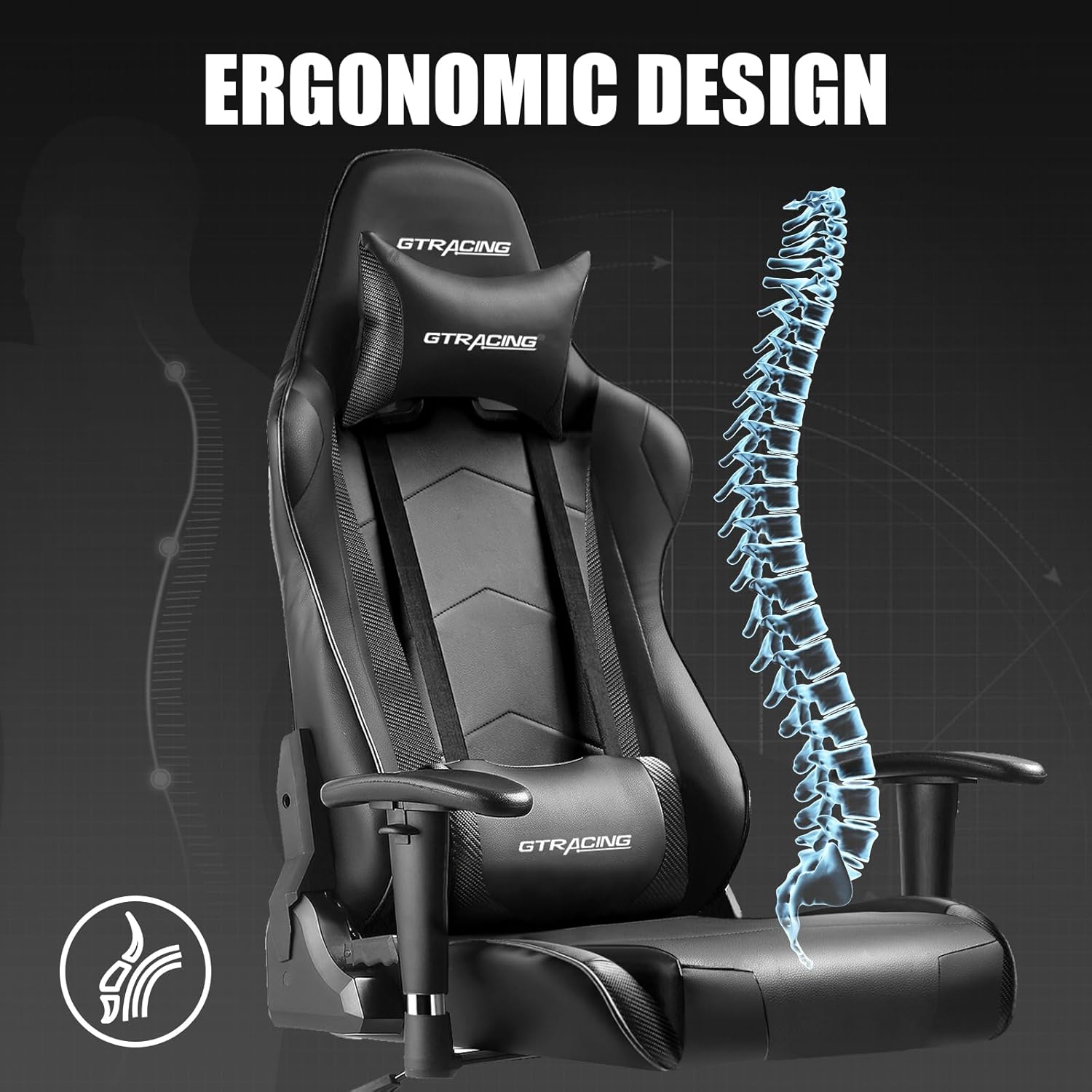 【Ergonomic Design】Gaming chair features a professional ergonomic design that follows the natural curve of the spine.Stay comfortable during long gaming or work sessions with a high-density padded seat, adjustable headrest, and lumbar support cushion that ease back and neck pressure throughout the day.