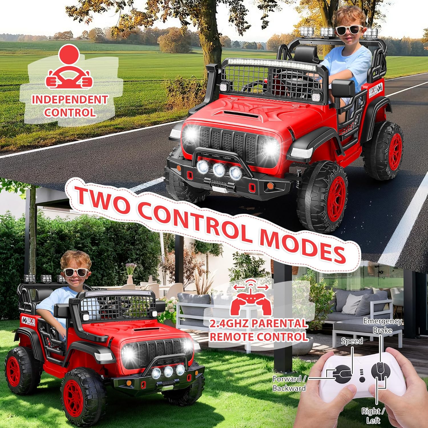 Advanced Safety Features: Dual 3-point seat belts, anti-slip seats, and parental remote control ensure maximum safety. Soft start and rear shock absorption provide smooth, secure rides for one child (4-8 years) or two children (combined age ≤8 years).