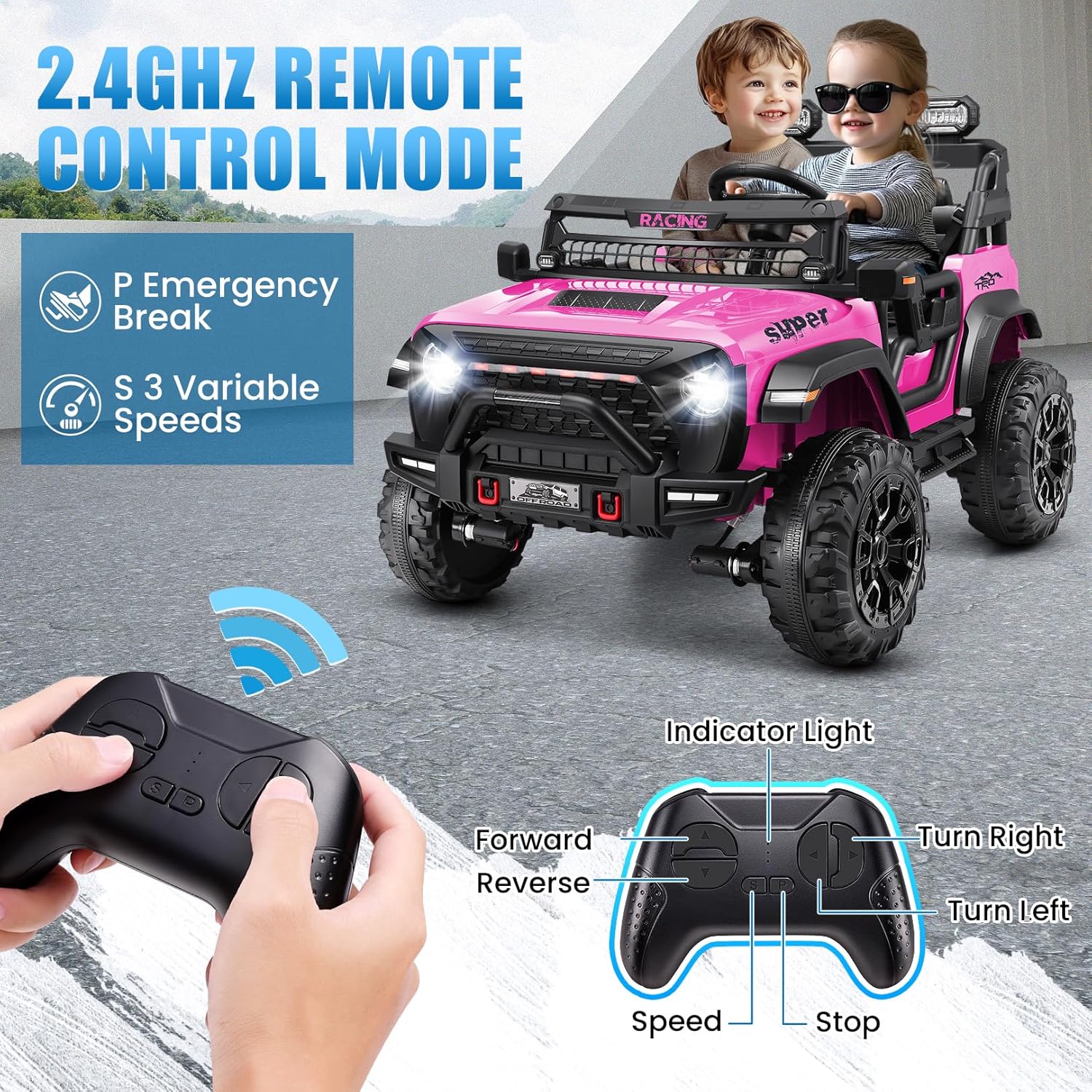 【Safe Driving and Remote Control】: The 24V battery powered cars features a soft start to prevent sudden acceleration, ensuring a smooth ride. Its full metal suspension provides excellent shock absorption, reducing bumps on rugged roads. Parents can use the remote to stop the car, adjust speed, or change direction, always overriding the child’s control for maximum safety.