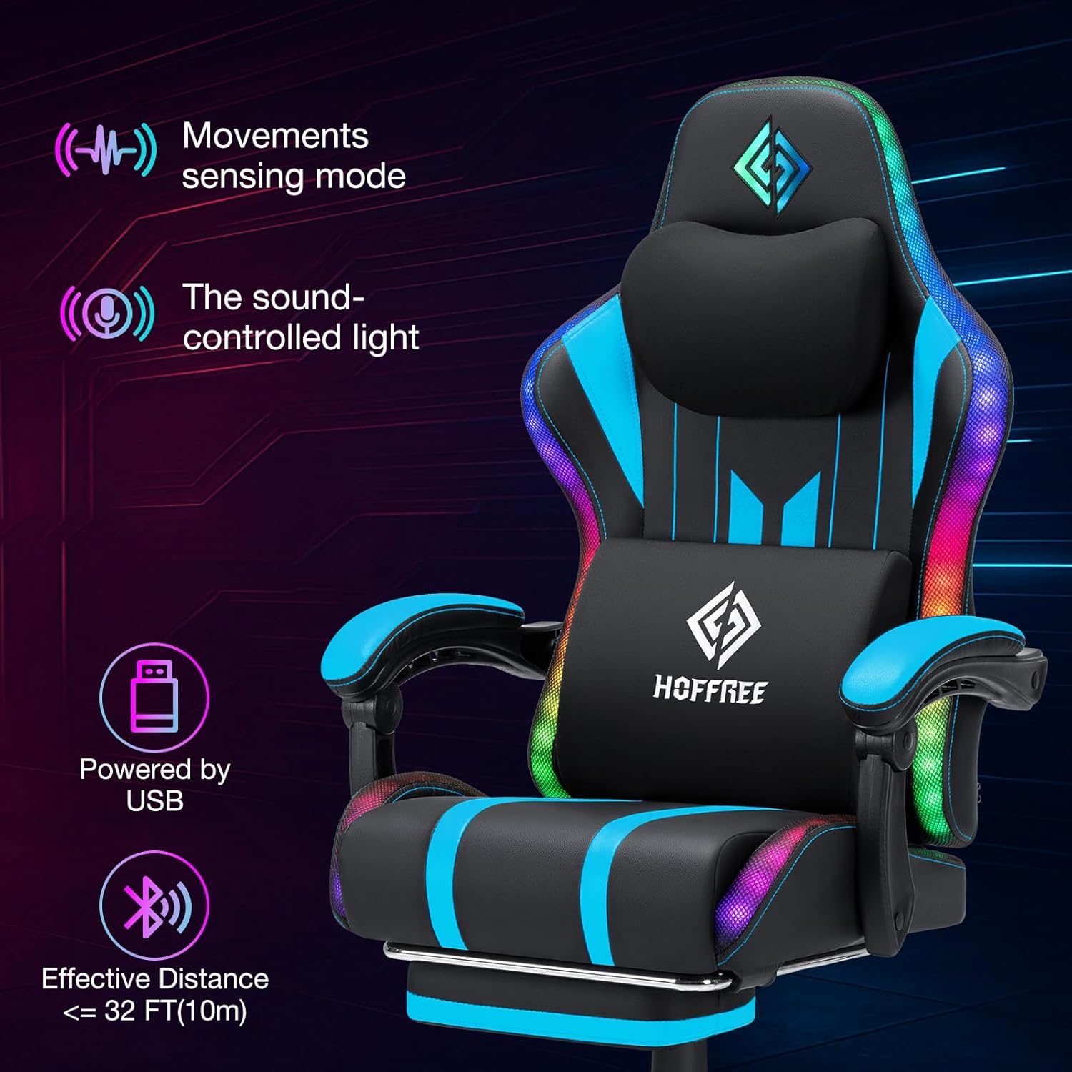 【Music Rhythm RGB Light】This RGB game chair designed with led lights on the logo and edges of the back, and has 358 lights modes,also can adjust brightness and changing speed of lights.This led gaming chair features a built-in sound-sensitive so that you can choose the music rhythm mode to make the lights on the chair change with the rhythm of the music or your actions sounds.