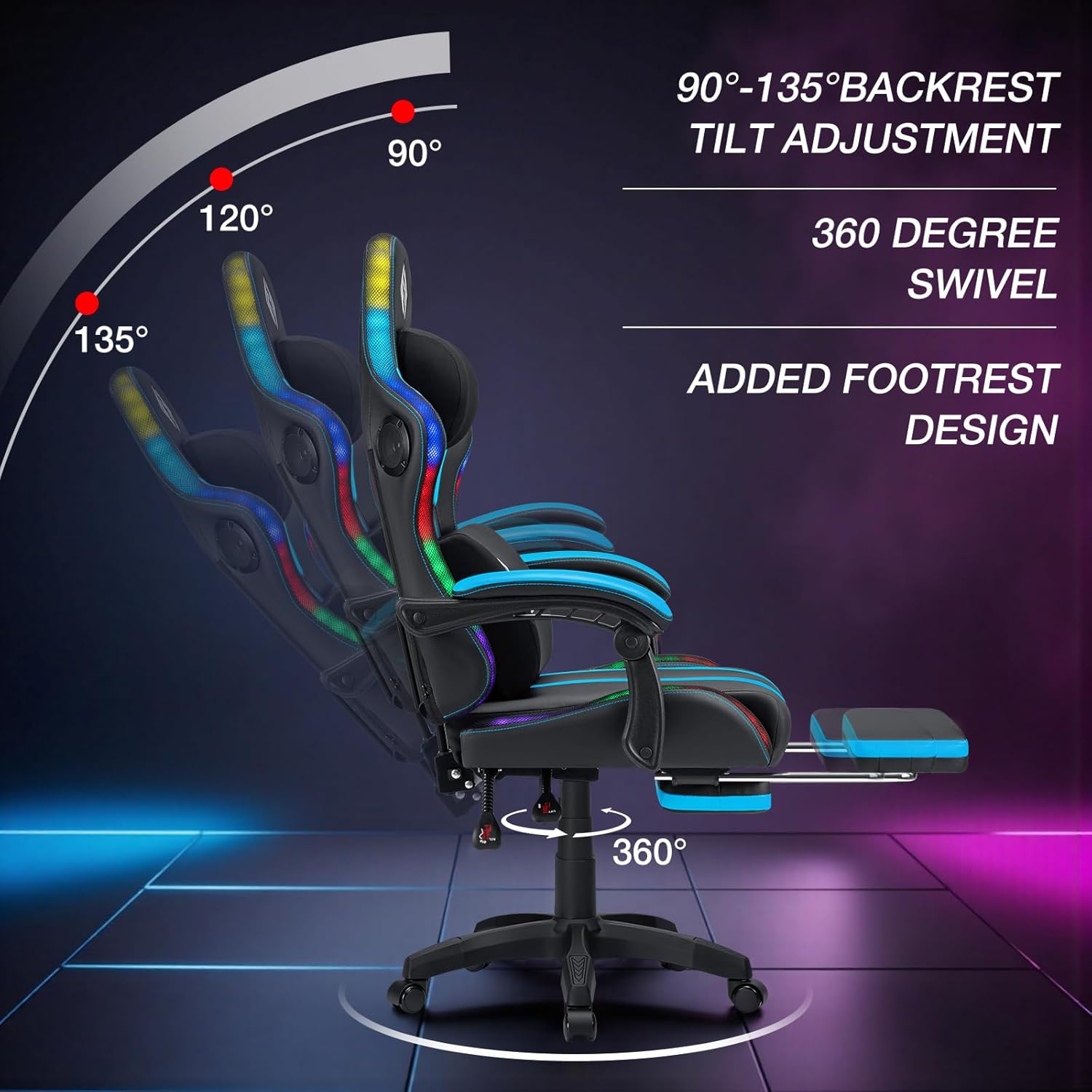 【Reclining Game Chair】90°-135°adjustable reclining gaming chair with footrest for working, gaming, reading or napping and linkage armrest chair is more comfortable when relaxing. Gamer chair also with 360°rotating multi-directional racing-car rollers. Installation can be completed very quickly according to the instruction manual