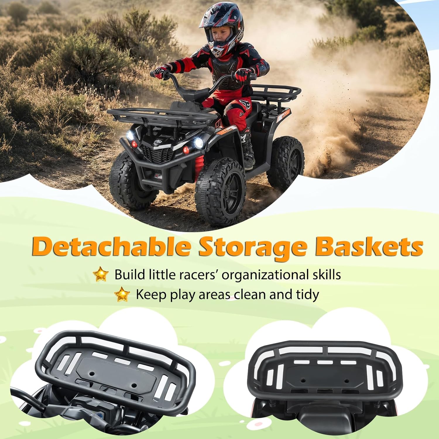 Removable Storage Basket: This kids quad bike features a detachable storage basket that’s perfect for little explorers to carry toys, snacks or treasures found along their adventures. Additionally, this practical addition enhances convenience, allowing your little ones to focus purely on the joy of their ride and promote organizational habits.