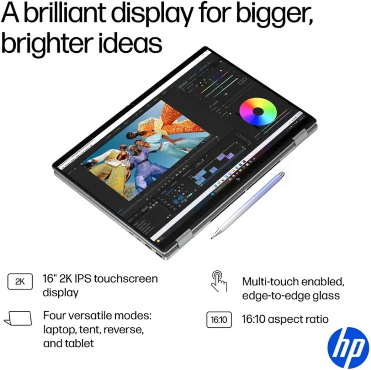 Command your digital world on the expansive 16-inch Full HD+ (1920 x 1200) touchscreen. The vibrant IPS panel boasts 400 nits of brightness, wide 178-degree viewing angles, and AMD FreeSync technology for incredibly smooth visuals. The intuitive edge-to-edge glass touch display and versatile 360-degree hinge allow you to effortlessly switch between laptop, tablet, tent, or stand modes for work, presentations, or entertainment.