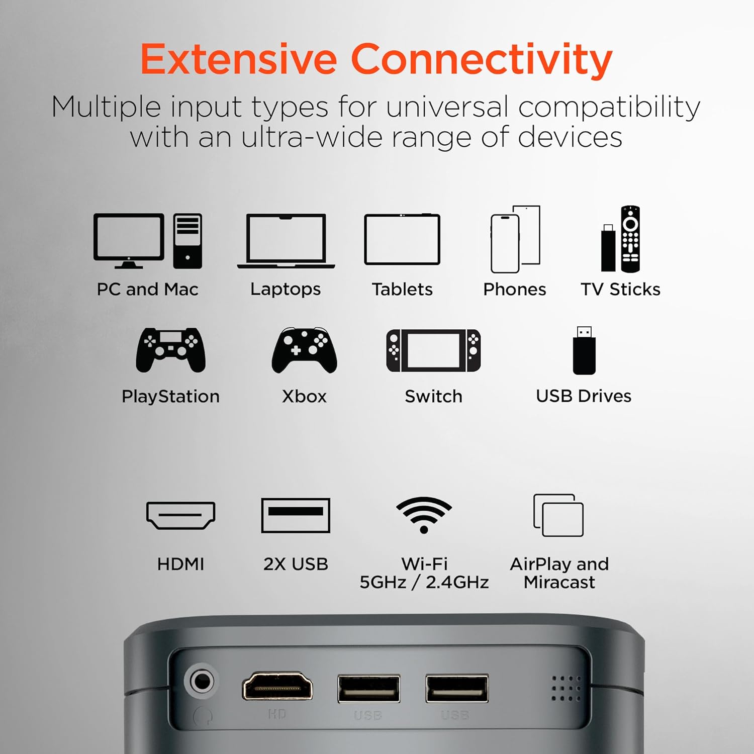 Extensive Connectivity: Multiple input types make CinéMini compatible with an ultra-wide range of devices. HDMI support lets you plug in your laptop, game console, Blu-ray player, or TV stick, while dual USB ports let you play content from USB drives. Use the included USB-C to HDMI adapter to plug in your Android device or USB-C compatible iPhone, iPad, or MacBook – or wirelessly connect your mobile devices over Wi-Fi via Miracast or AirPlay.