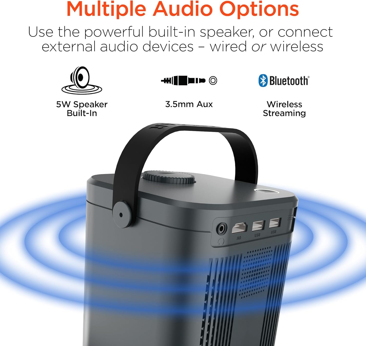 Vivid and Vibrant Image Quality: Enjoy crystal-clear and detailed picture quality with 1280 x 720p HD resolution. The 3.5” LCD projector panel is powered by a 60W LED light source to deliver ultra-bright images with 160 ANSI lumens and a 1000:1 contrast ratio – which means deeper blacks, brighter whites, and more vibrant colors in all your movies, games, and streaming content.