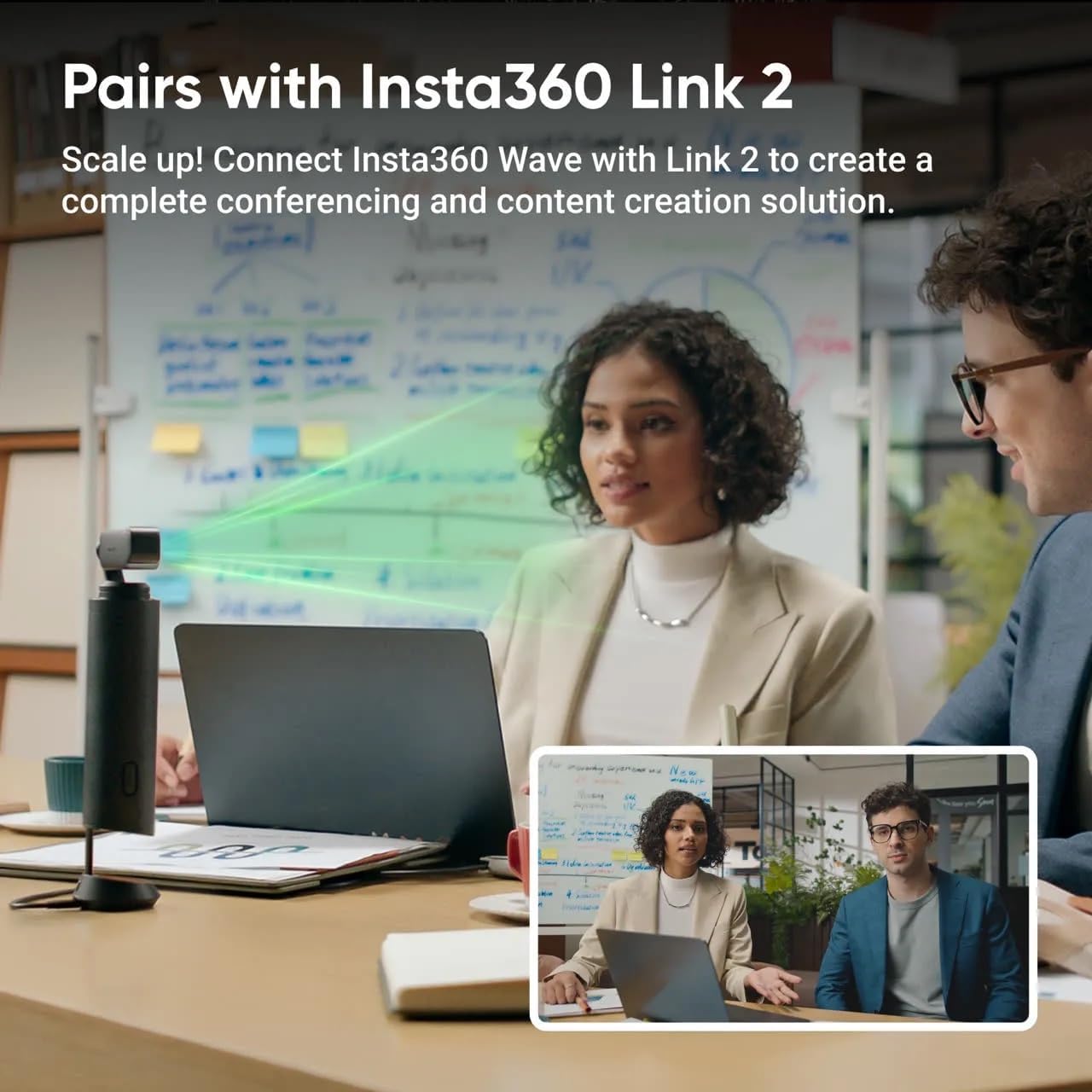 Premium Audio Quality: Equipped with AI audio algorithms, Insta360 wave eliminates environmental noises, cancels echo and reverberation. Directional Pickup:Employs 5 precision-engineered pickup patterns to get the optimal audio quality for different use and different surroundings. AI Recording:Insta360 Wave not only captures voices, it records and remembers. With full internal recording, no matter online or offline, make sure ideas are captured. AI Transcription:Supports transcription in 99 languages, plus get up to 300 mins transciption & summaries every month free. AI Meeting Assistant:Integrates with the latest in AI. Get exclusive summaries from meetings, and ask AI for deeper analysis and insight right on the device. Supports Insta360 Link 2:Using the latest in Insta360’s conferencing ecosystem, mount Insta360 Link 2 (sold separately) on Insta360 Wave to get a complete audio-visual solution. 3D 8-Mic Array & 16ft Voice Pickup:Equipped with 8 microphones, Insta360 Wave captures voices up to 16 ft away at a 48kHz premium sampling rate. Dedicated Insta360 InSight Web App:The InSight web app is your all-in-one hub for seamless recording management. Centralize your audio and get AI-powered insights. Easily share summaries and never miss any detail. Versatile Connectivity:Choose from multiple connection options—USB cable, Bluetooth, or dongle—for seamless setup and flexibility in any environment. Flexible Plans:Once you activate your Wave, you’ll get a free plan with 300 monthly transcription minutes and free summaries . Need more? Subscribe to the InSight Pro Plan for $8.33/month (annually). It includes 1200 minutes, Ask AI, and advanced features to take productivity to the next level.