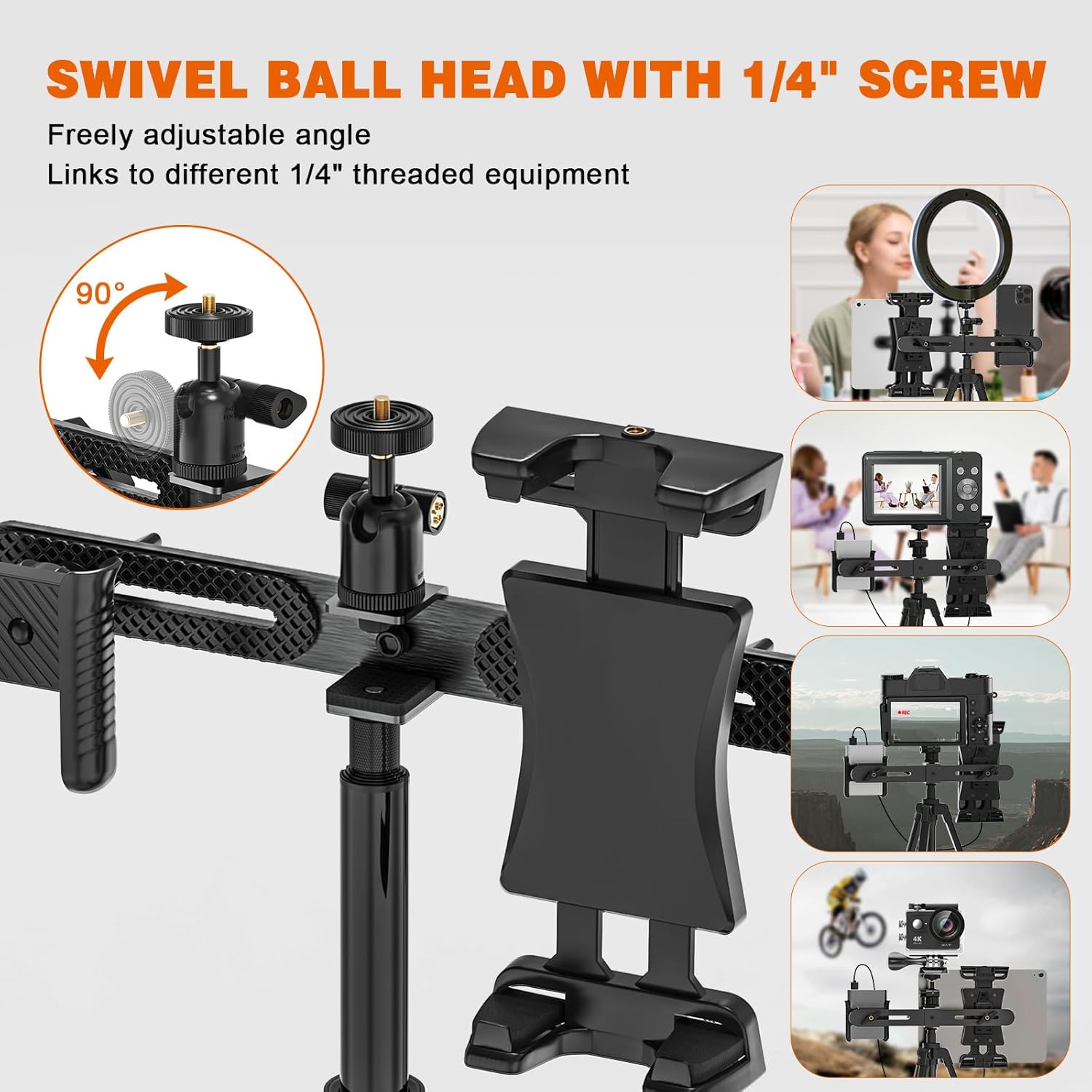 3-in-1 Tablet Tripod Mount: This versatile iPad holder comes with dual clips, accommodating devices between 4.7″ and 12.9″, such as iPads, tablets, and smartphones. It also features a 1/4″ swivel ball head, perfect for attaching an LED ring light, DSLR camera, or webcam. Whether you’re live streaming, teaching remotely, or recording videos, this mount lets you use both tablets and phones while enhancing your setup with a ring light.