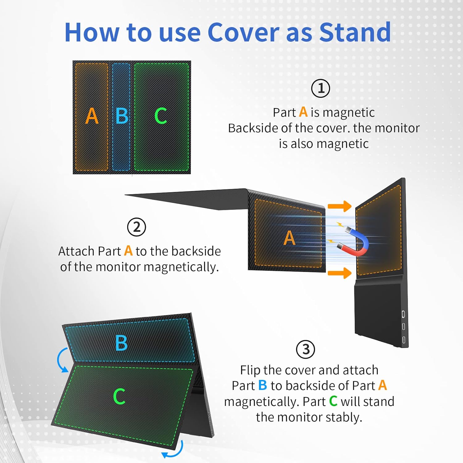 【What’s in Box】: In the box, there is a Type-C charging cable, a Type-C, mini HDTV adapter cable, a Type-C, mini HDTV video cable, 1 touch screen monitor, 1 removable protective cover, 1 user guide, and a 10W adapter. Comes with a scratch-resistant Smart Sleeve made of durable PU leather on the outside that doubles as a stand and provides excellent protection for the entire laptop display.