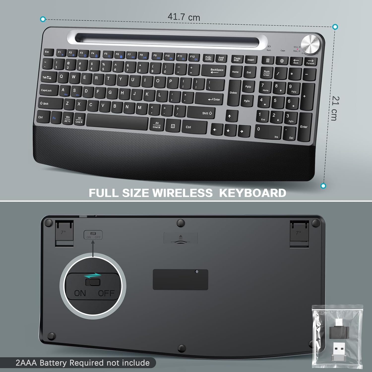 Wireless Ergonomic Keyboard with Wrist Rest:The wireless keyboard is equipped with a wide palm rest and tilted legs, helping you keep your wrists and forearms in a more natural and relaxed posture. The low-profile wireless keyboard makes soft clicks during typing without disturbing others during rest, work or play. The specially designed volume knob enables you to make adjustments more quickly.(No mouse included)