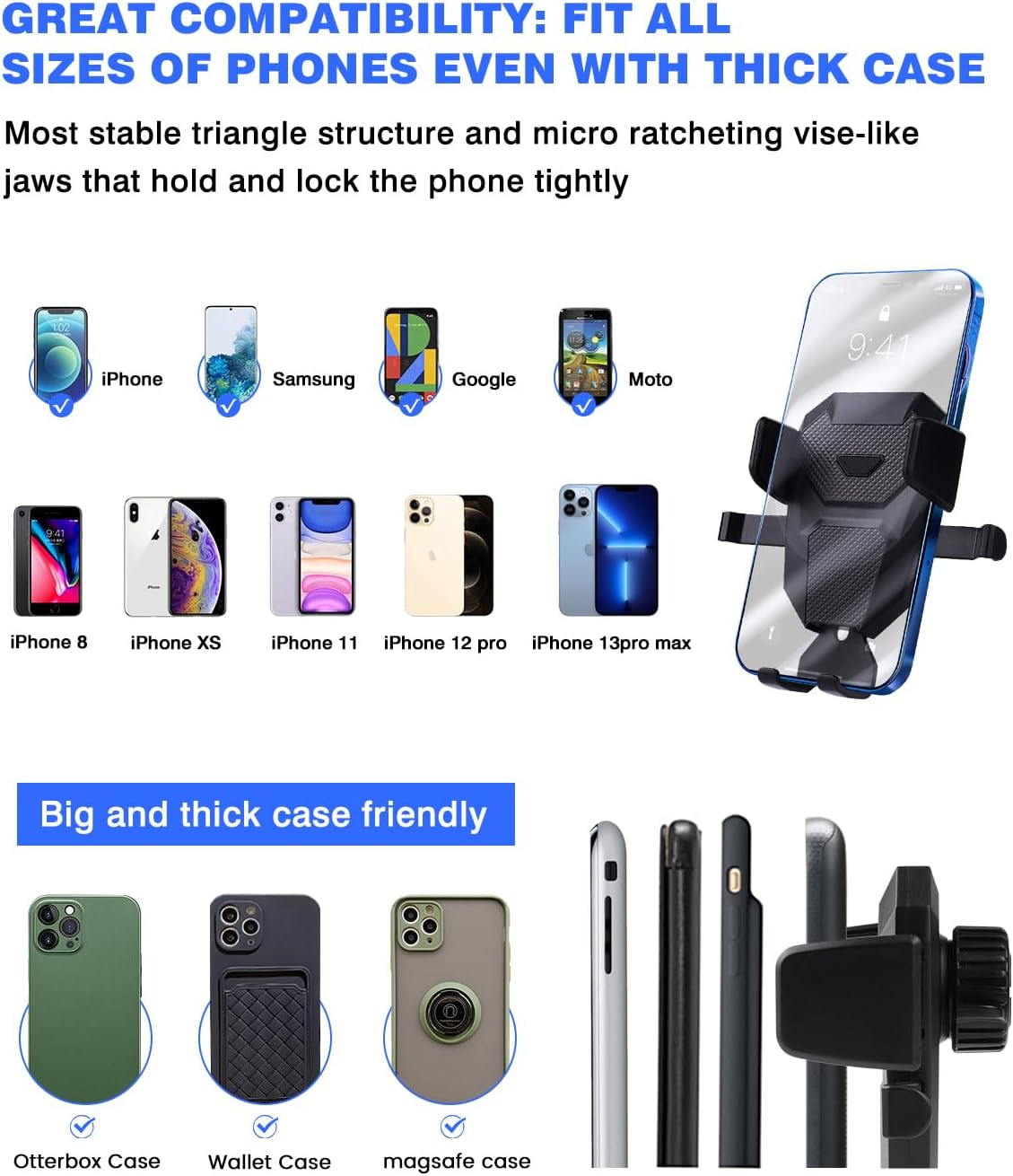 【Hold Your Phone Securely】The CX50 cell phone holder can be used vertically or horizontally. It adopts stable mechanical structure and adjustable bottom tray, which will definitely grab and hold your phone firmly and securely in any conditions. Doesn’t shake, move around or fall off even in sharp turn or bumpy roads.