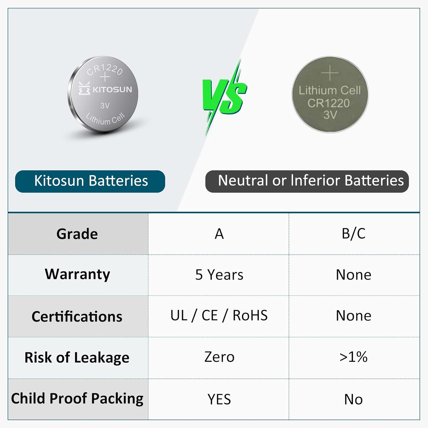 Long-Lasting Batteries Designed for Dependability: 10 Years Storage Shelf Life. 45mAh Capacity which is 10% higher than standard CR1220. Kitosun Lithium coin batteries deliver the long-lasting power and performance you can count on for electronic devices throughout the home or on-the-go. You can be confident these batteries will be ready when you need them