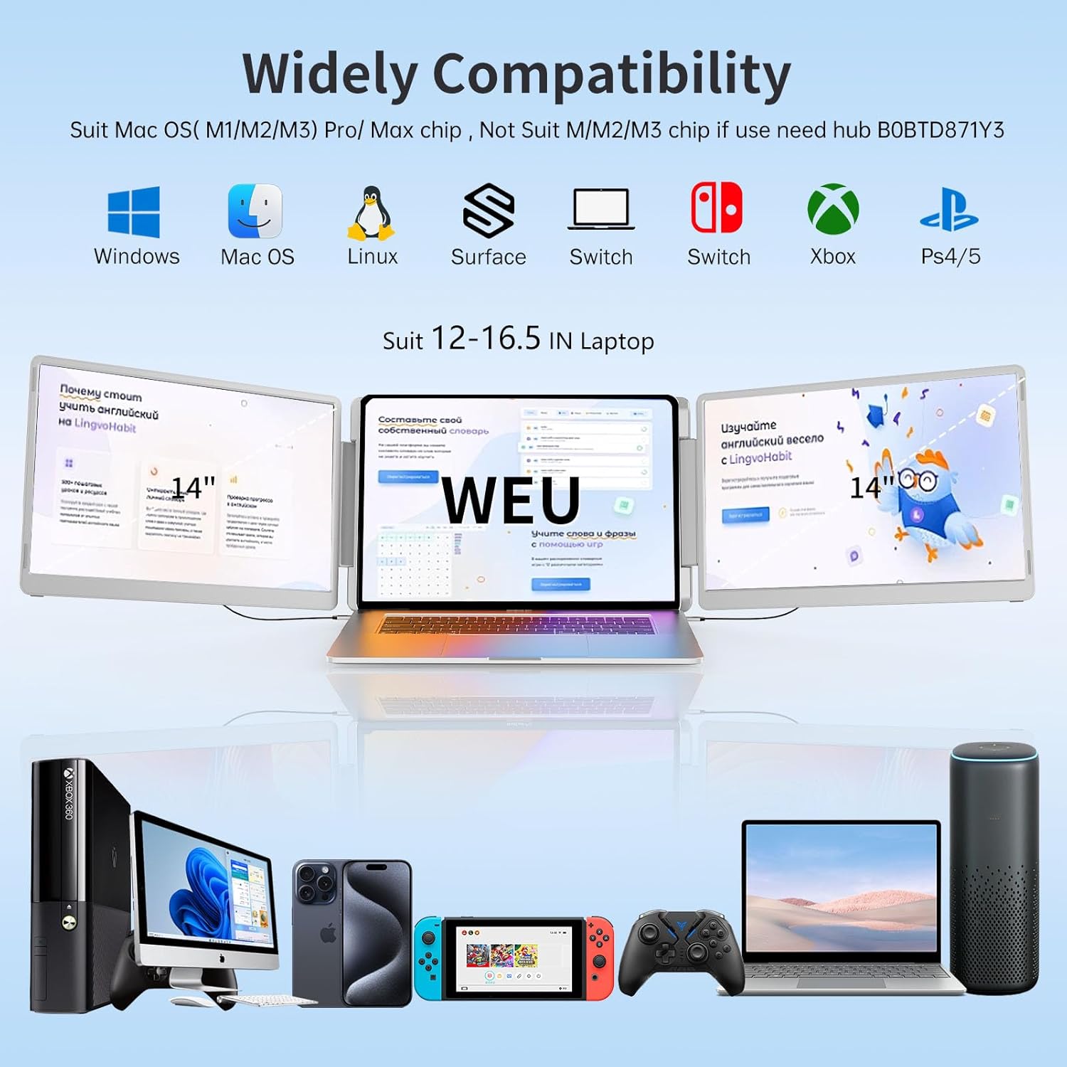 ➤【Widely applicable & Plug and Play No Need Driver】-The Portable Triple Monitor for Laptop compatible most Windows,Mac OS,Linux,Intel ,Chrome,Switch,PS4/5,Xbox One (Suit Mac M1 Pro/Max , M2 Pro/Max, M3 Pro/Max chip laptop,not suit M1/ M2 /M3 chip laptop if use need hub). Please make sure your laptop has 2 C ports or C + HDMI port or 2 HDMI ports. Tips: Some laptops USB-C port is not full function (only support power or video signal), please check before use.