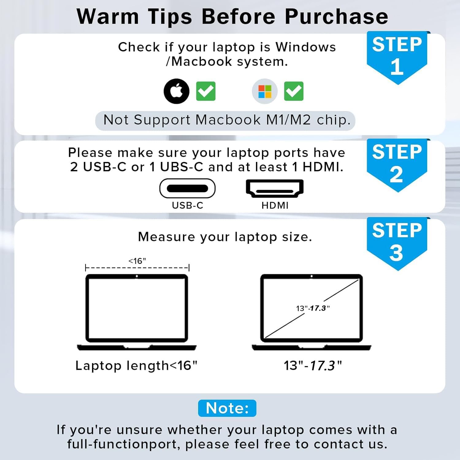 1.Please make sure your laptop support 2 video signals transfer so that to make the dual screens of S2 working well. It means your laptop will have 2 full featured Type-C(support video signal and power supply together) interfaces or 1 full featured Type-C & 1 HDMI +1 USB-A interfaces or 2 HDMI+2 USB-A interfaces.