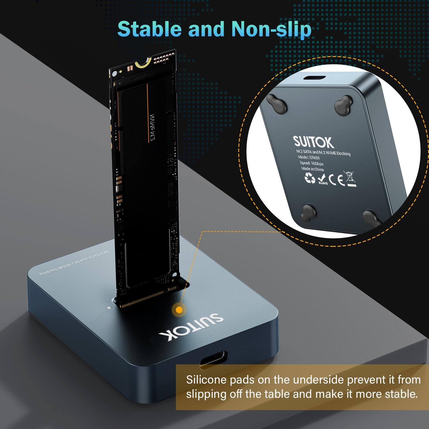Premium Design with Portability and Excellent Heat Dissipation: M.2 dock constructed with a high-quality aluminum alloy shell, this NVMe to USB adapter offers durability and superior heat dissipation. NVMe hard drive reader with a non-slip silicone pad on the bottom provides stability on any surface. M2 SSD reader compact dimensions (2.60 x 2.01 x 0.51 Inches) and lightweight design (2.18 Ounces) make it highly portable for use at home, in the office, or on the go.