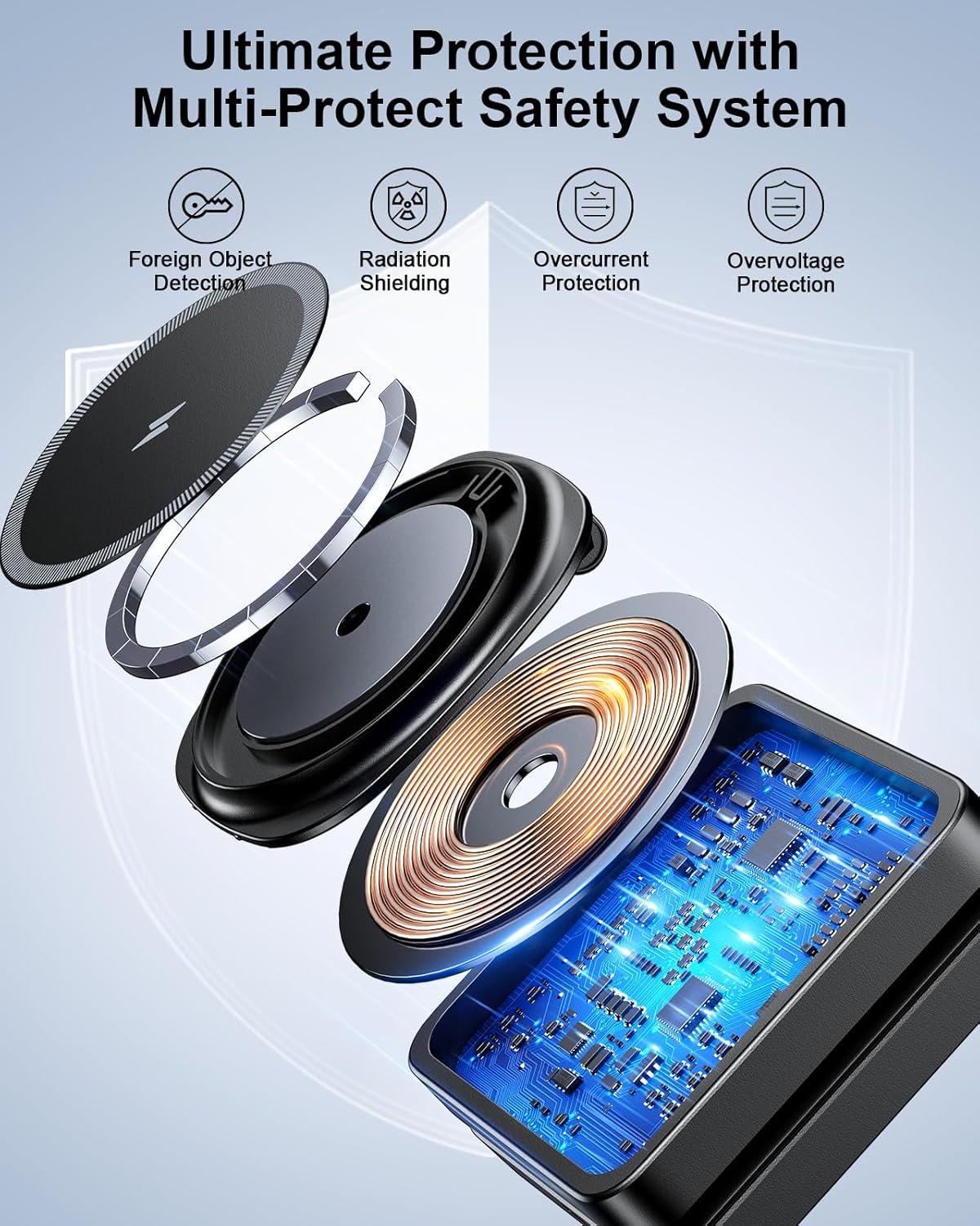 ✅【Multi Intelligent Protection & Sleep Friendly】 Our wireless charging station ensures a safe and secure charging experience. It’s equipped with intelligent protection technology,offer multiple protections, including over-voltage and over-current protection to protect your device’s battery health, temperature control to keep your device cool, and short-circuit protection for enhanced safety. The LED indicator light is weak while charging and won’t disturb your sleep.