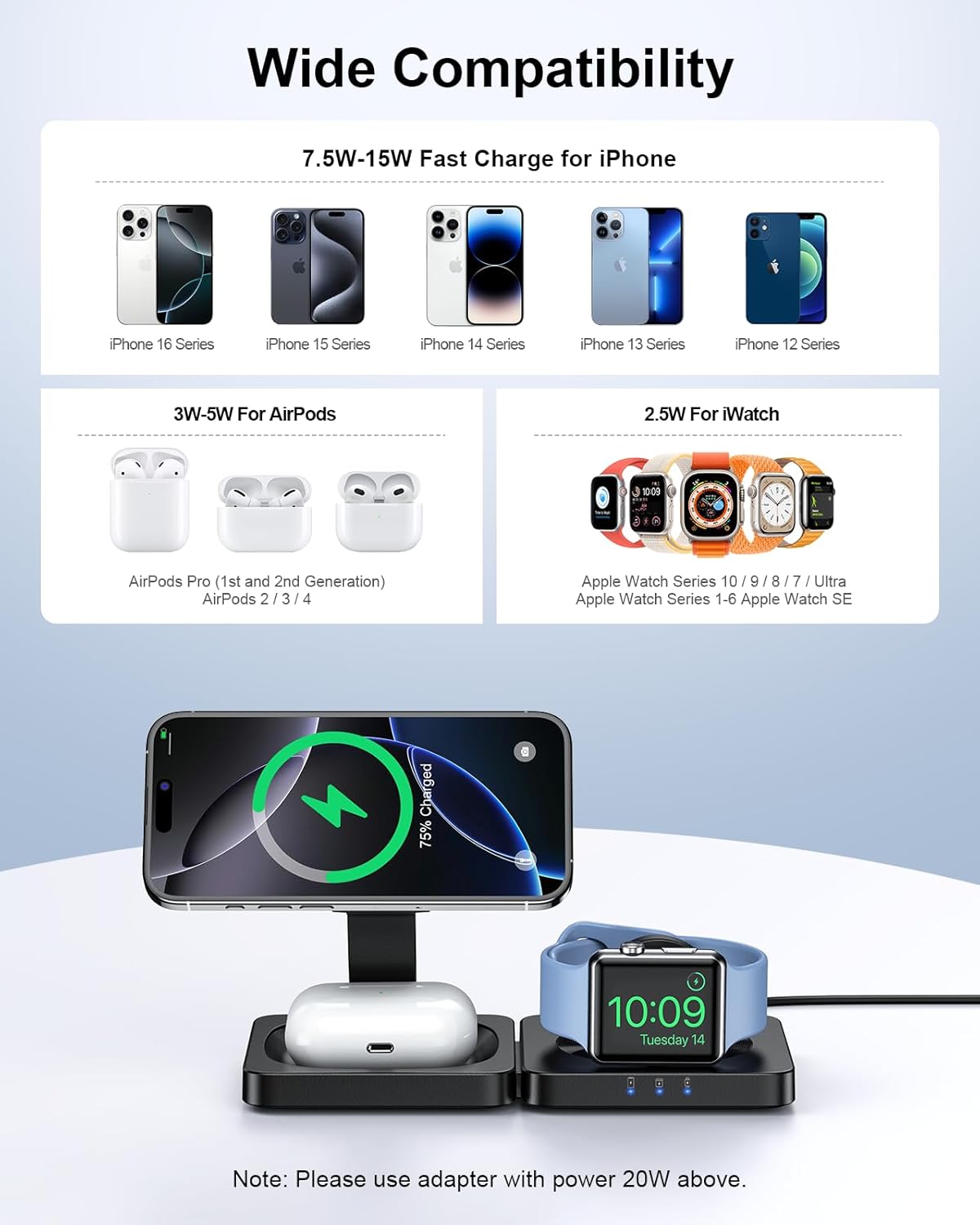 ✅【3 in 1 Foldable Charger Station】 This 2025 new 3 in 1 foldable charging station for Apple devices uses a new copper alloy coil that can increase the power conversion rate by 50%. Apple charging station can efficiently charge up to 3 devices at the same time, with a max charging power of 15W max for iPhone, 5W max for AirPods, and 2.5W for iWatch. Compatible with iPhone 16/15/14/13/12 series, Apple Watch 10 9 8 7 6 5 4 3 2 Ultra 2 1, AirPods Pro/4/3/2. Also compatible with more wireless charging phone devices.