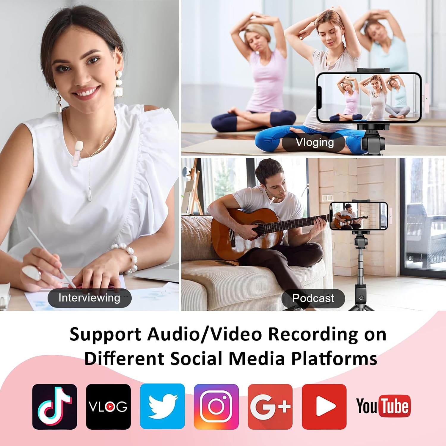 2 Clip on Microphones(Pink): The blue tooth microphone is designed with lavalier feature and there are clips included in the package. You can either hold the mic on your hand or clip it to your shirt. Besides, there are 2 microphones contained in the package, which means you can make recordings to pick up sounds from 2 parties at the same time