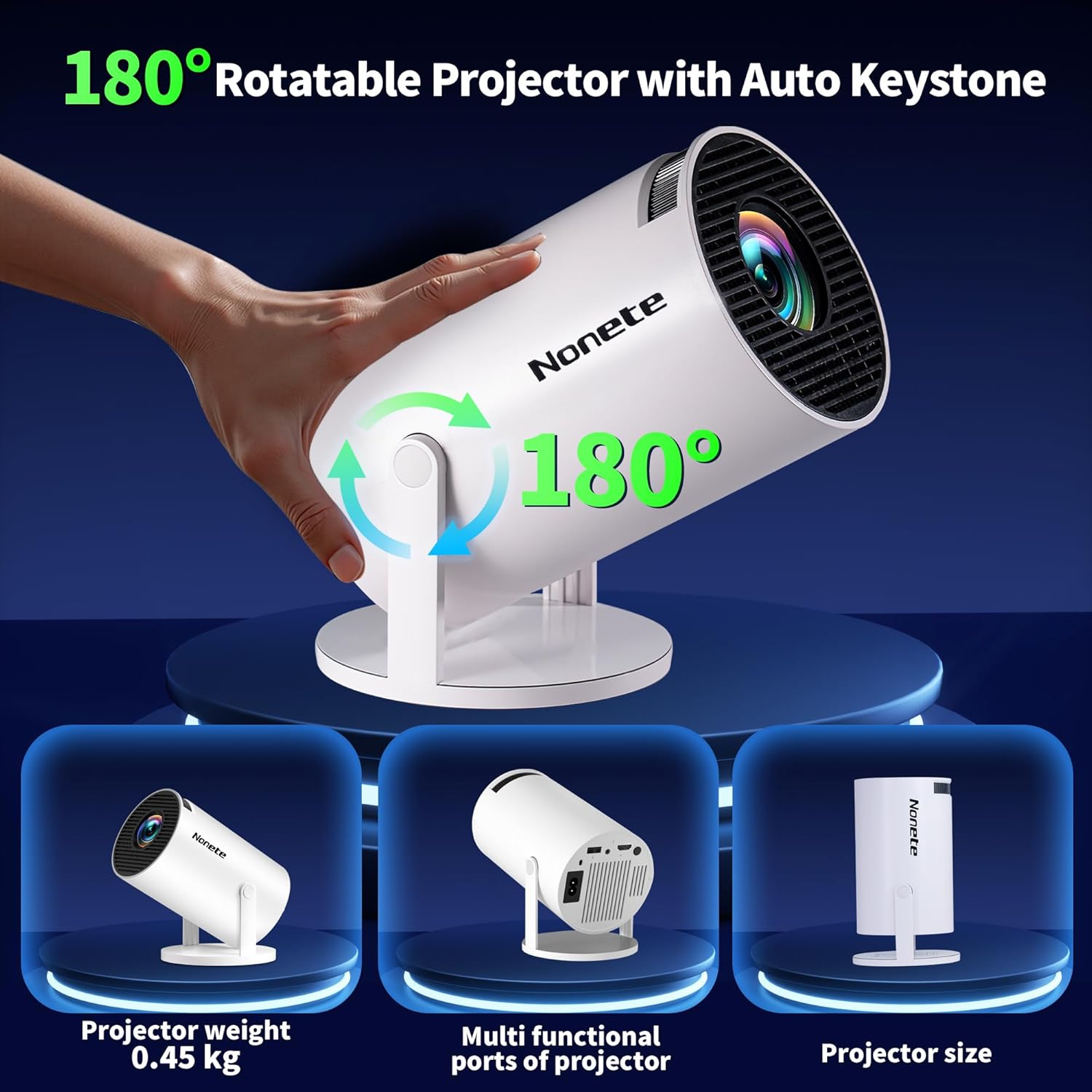【Flexible Installation and Portable Design】The smart projector supports a tripod, ceiling mount, and desktop placement, featuring a standard 1/4-inch screw hole for easy and secure installation. With 180° image rotation, you can project from any angle, whether in the living room, bedroom, conference room, or outdoors. Enjoy a large-screen experience anytime & anywhere.