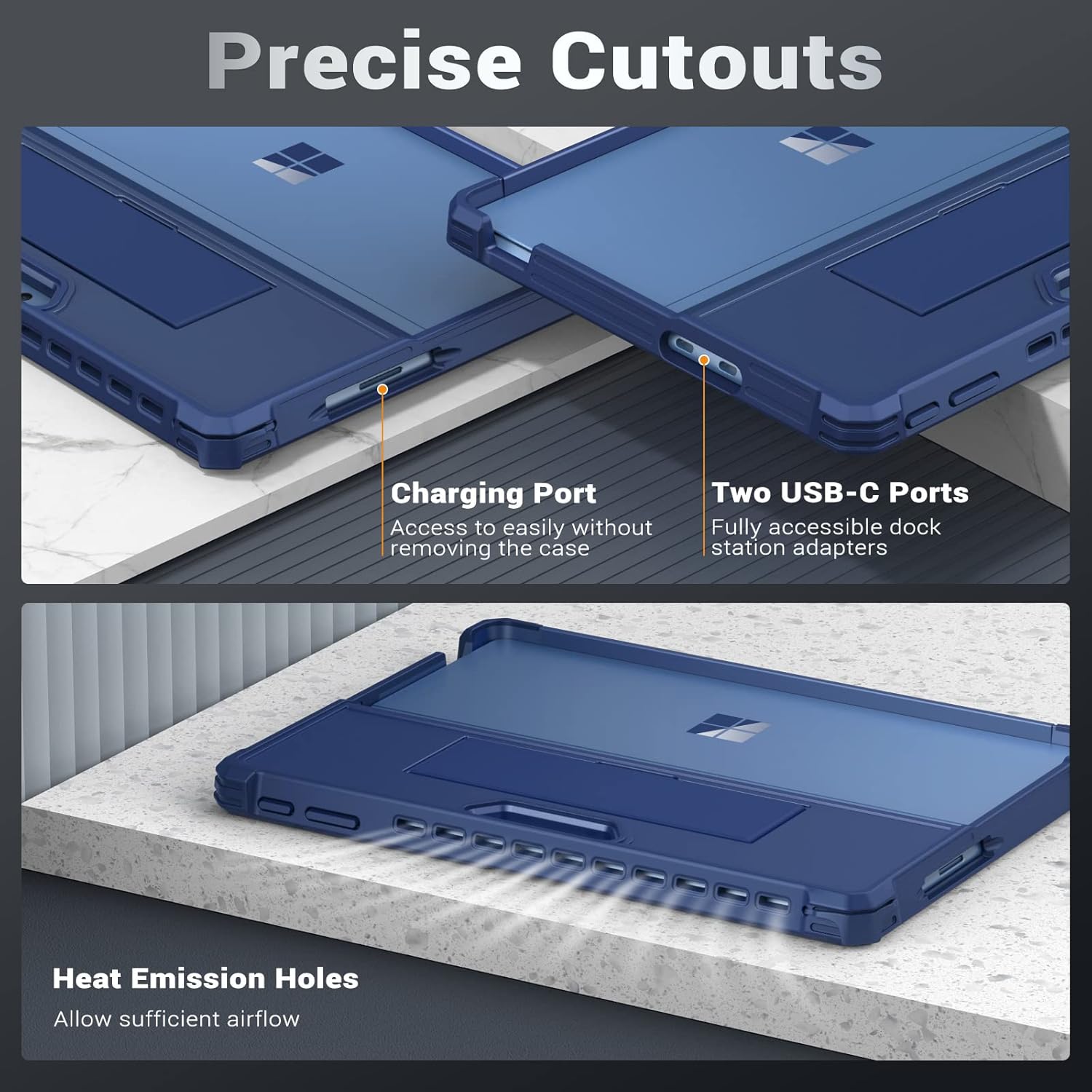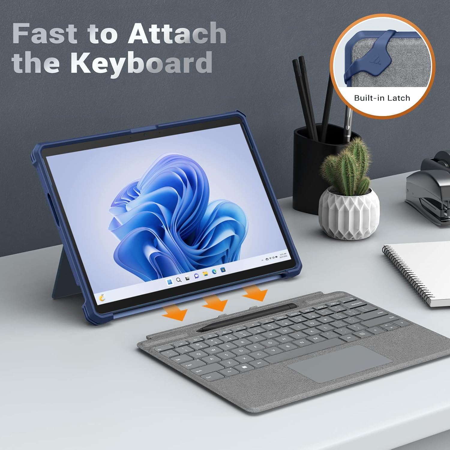COMFORTABLE WORKING EXPERIENCE: With channel for directly connecting to Microsoft Surface Pro 11, Pro 10, Pro 9 type cover keyboard for an instant so that the user can use it without removing the case. The reserved back cutout allows the user to adjust Microsoft Surface Pro 11, Pro 10, Pro 9 tablet kickstand freely to find the best viewing angle, writing angle or typing angle.