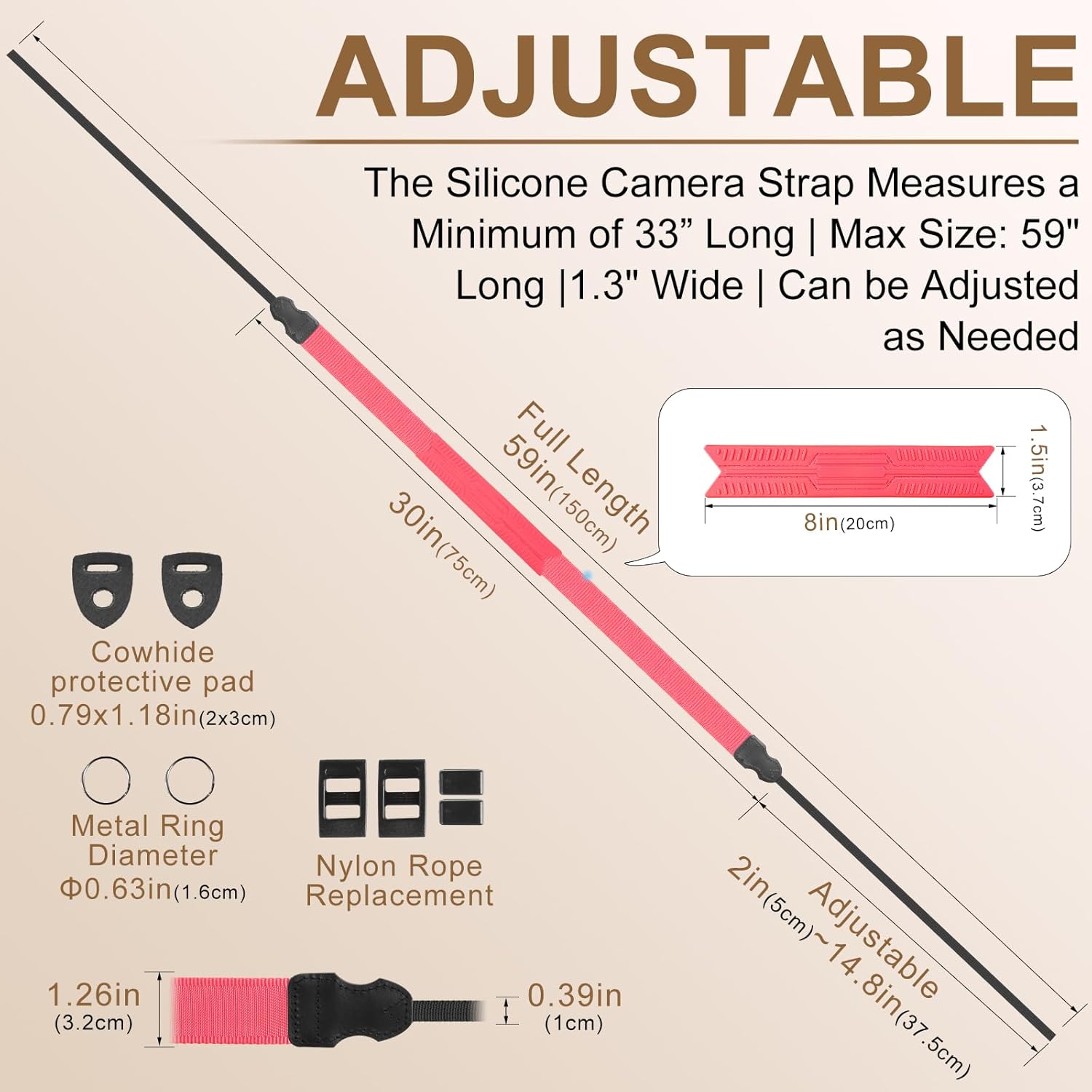 ADJUSTABLE RANGE: The camera shoulder strap’s length is adjustable from 33 to 59 inches, the shoulder pad is 1.5 inches wide, and the strap is 1.26 inches wide. Therefore, you can adjust the length as needed, and the silicone shoulder pad fits perfectly without slipping, ensuring optimal comfort.