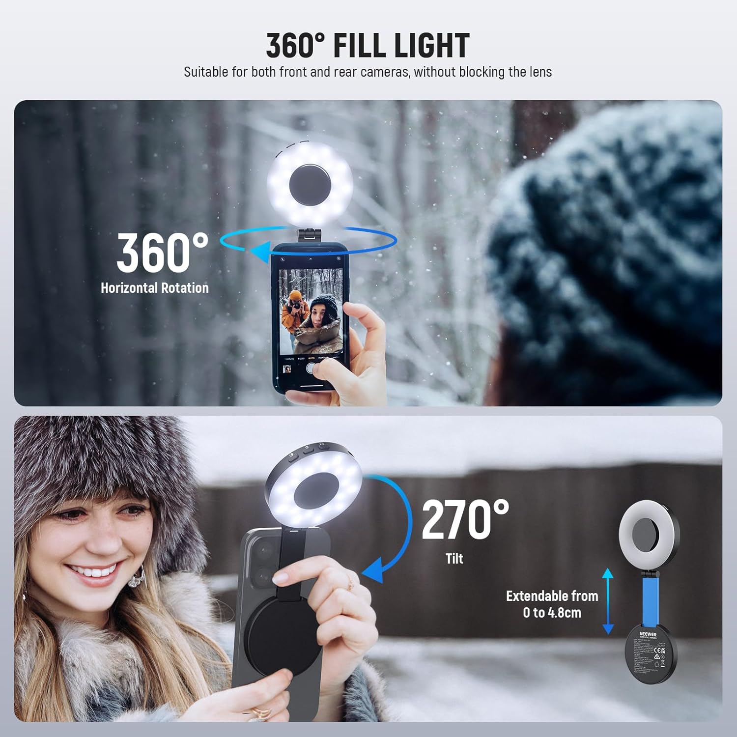 【360° Swivel Magnetic Selfie Light】 The mini fill ringlight as photography accessories is compatible with MagSafe iPhone 16 Pro Max Plus 15/14/13/12 iPad Pro and other magnetic devices. For nonmagnetic devices, use the included adhesive magnet ring to mount it to Android phone for overhead filming recording or desk laptop for video calls, compatible with Samsung Galaxy S25 S24 S23 Ultra, etc. Supports 360° horizontal rotation and 270° vertical tilt, flexible for both front and rear camera use