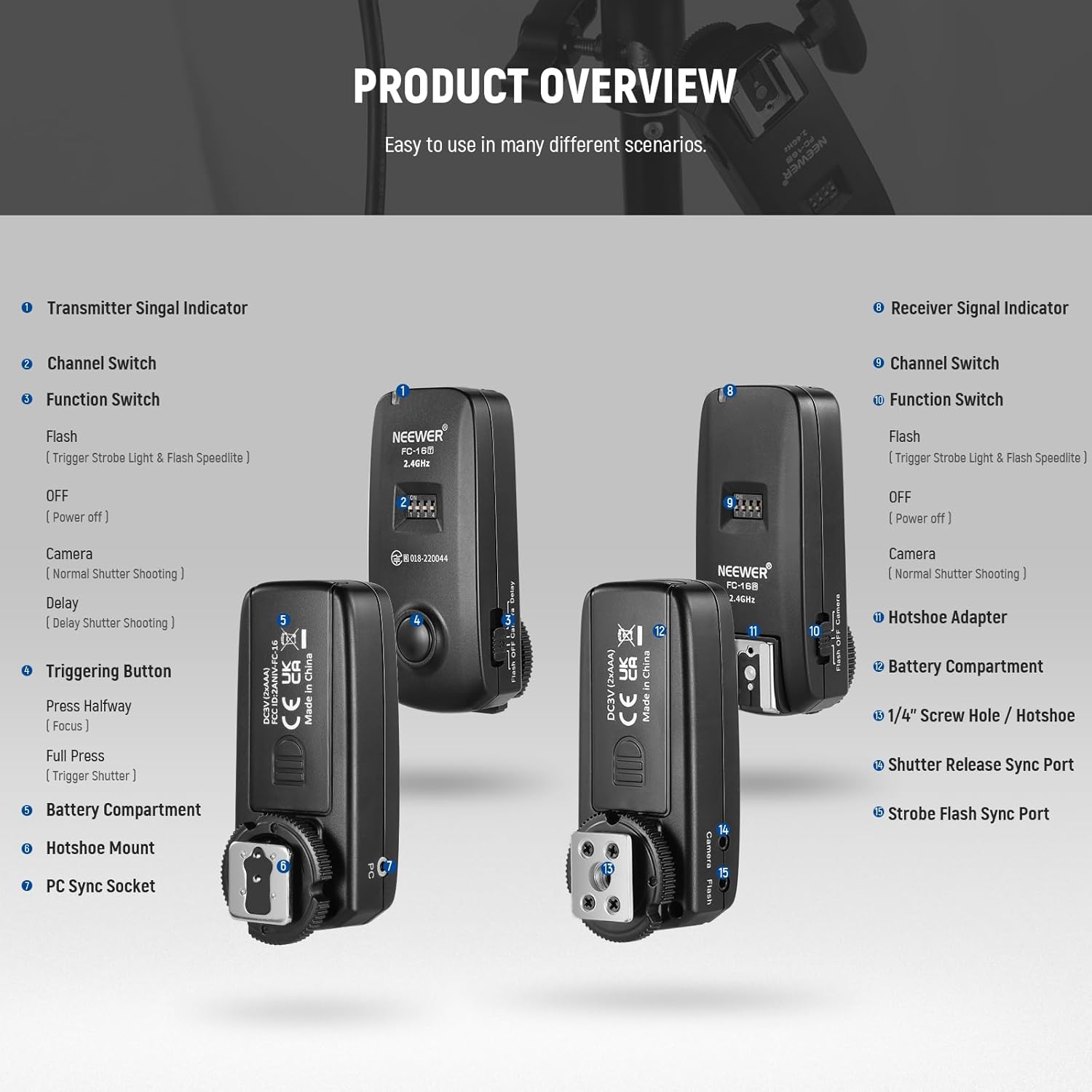 【3 in 1 Multi Functional Flash Trigger】 This remote flash transmitter can be used to trigger (1) the wireless synchronous studio strobe flashes, such as NEEWER S101-300W S101-400W S101-400W PRO Q300 flash; (2) It can be used as wireless trigger for speedlite flashes; (3) It can also be used as wireless camera shutter release