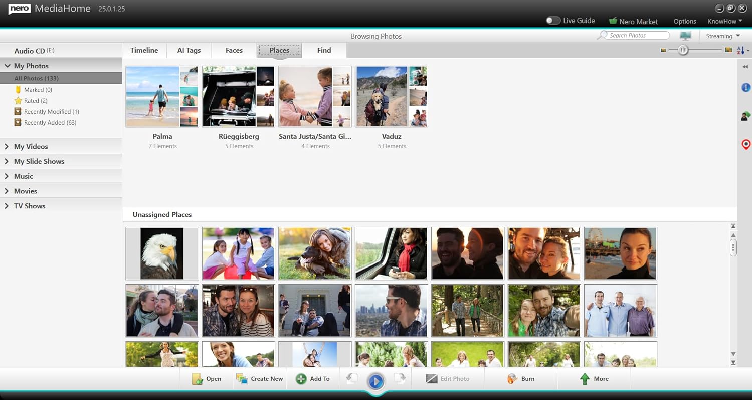 Find instead of search: Give your multimedia files a home. Bring photos and videos wirelessly from your iOS or Android mobile device, USB from external hard drives or memory sticks to your PC. Import music files or rip music from audio CDs – even with original album art thanks to Gracenote technology. Archived in clear categories, sorted by recording date, faces, locations, favorites, or personal keywords, you can now find all media even faster with Nero MediaHome software. Windows Media Player and iTunes media libraries can now also be integrated directly.
